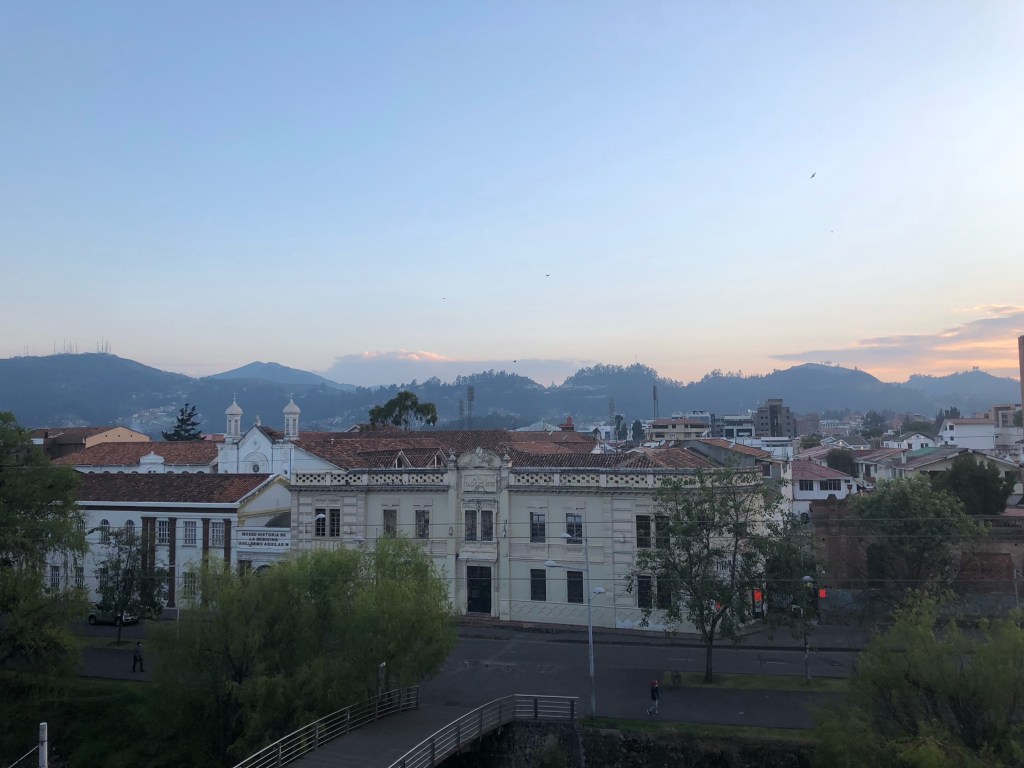 Lundi matin, Vilcabamba. Avant de quitter ce charmant village, je prends un petit déjeuner sur la place centrale. Je fais alors (brièvement) la connaissance d’Iseha, un jeune américain du New Jersey fraîchement débarqué en équateur. Il est venu prêter mains fortes à un couple de ses compatriotes gérant une ferme dans la vallée. Nous trinquons à Joe Biden et je file dans mon bus, qui me dépose à Cuenca dans l’après midi.
