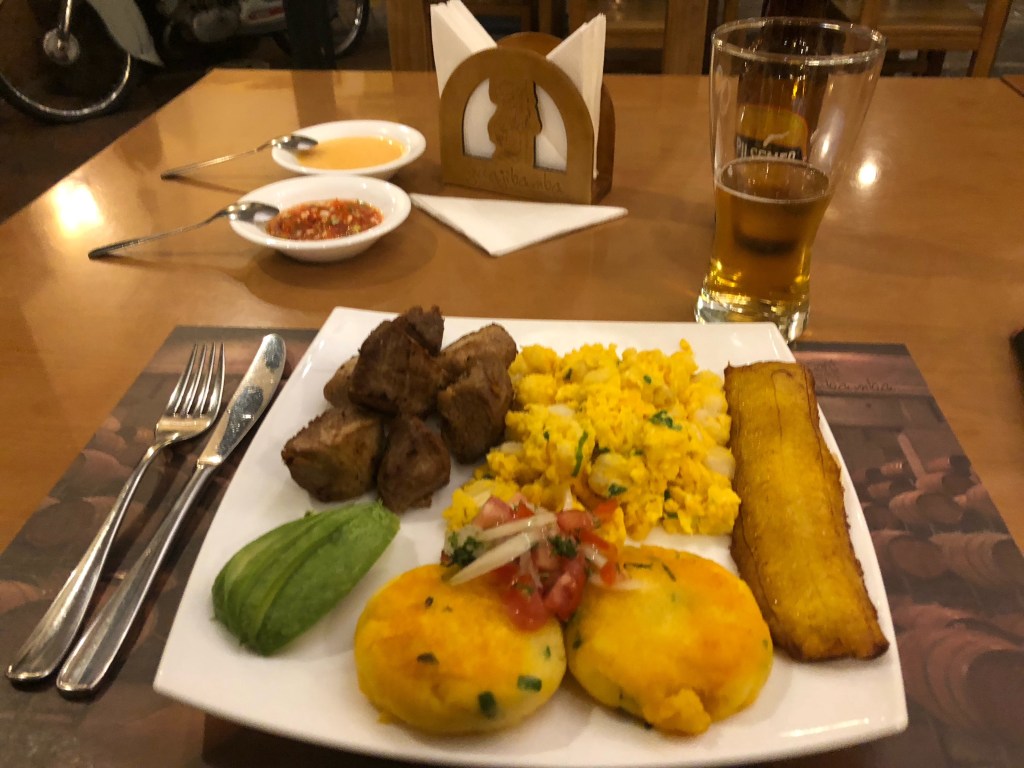 L’hostal Selina est propre et soigné, et mon dortoir tout à fait correct. J’ai néanmoins un colocataire : Mark, un américain lui aussi, lui aussi originaire du Colorado. C’est un drôle de personnage. J’apprends qu’il est sur les routes depuis 10 ans. En fait, il a pris la tangente après son diplôme, procrastinant son entrée dans la vie réelle. Il flotte ainsi d’un pays à l’autre depuis une décennie, dans un langoureux rêve éveillé qu’il porte dans son regard. Un sympathique hurluberlu. Je le laisse à son monde et m’installe confortablement sur la terrasse. J’établis un plan d’action pour gérer au mieux la préparation de mon voyage aux Galápagos (ma dernière décennie à moi s’est déroulée entre salle de réunion et Microsoft office, on ne se refait pas…). Afin de me récompenser de mes efforts, je m’offre un merveilleux restaurant équatorien, le Guajibamba, et me régale de spécialités locales. Je rentre profiter du calme de l’auberge pour une belle nuit de sommeil.