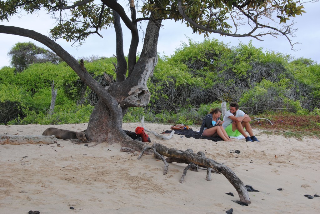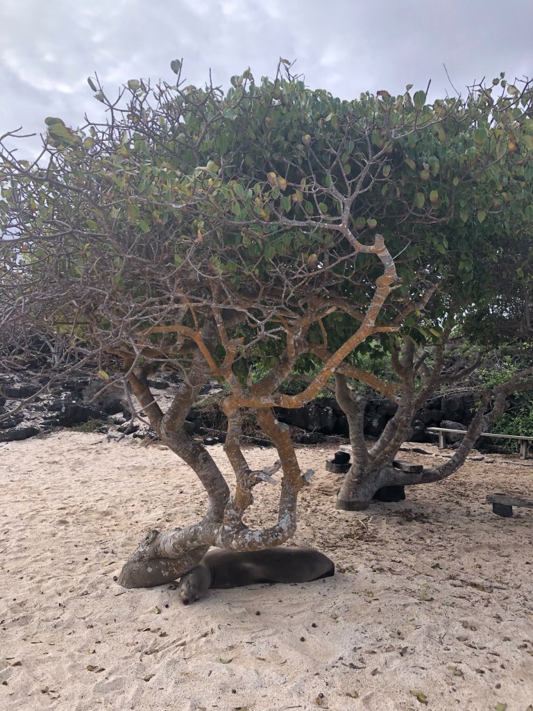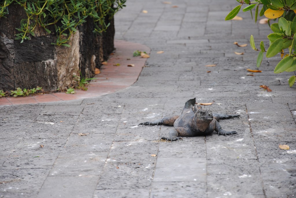 La visite terminée, je reprends le sentier, qui passe par une petite plage. Là, tout naturellement, un lion de mer dort au pied d’un arbre. Plus loin sur le chemin, c’est un iguane marin qui bronze sur la chaussée. Je continue mon chemin et croise à nouveau un lion de mer et une famille d’iguanes. Sans que quiconque ne s’en émeuve. Je suis dans un monde parallèle !