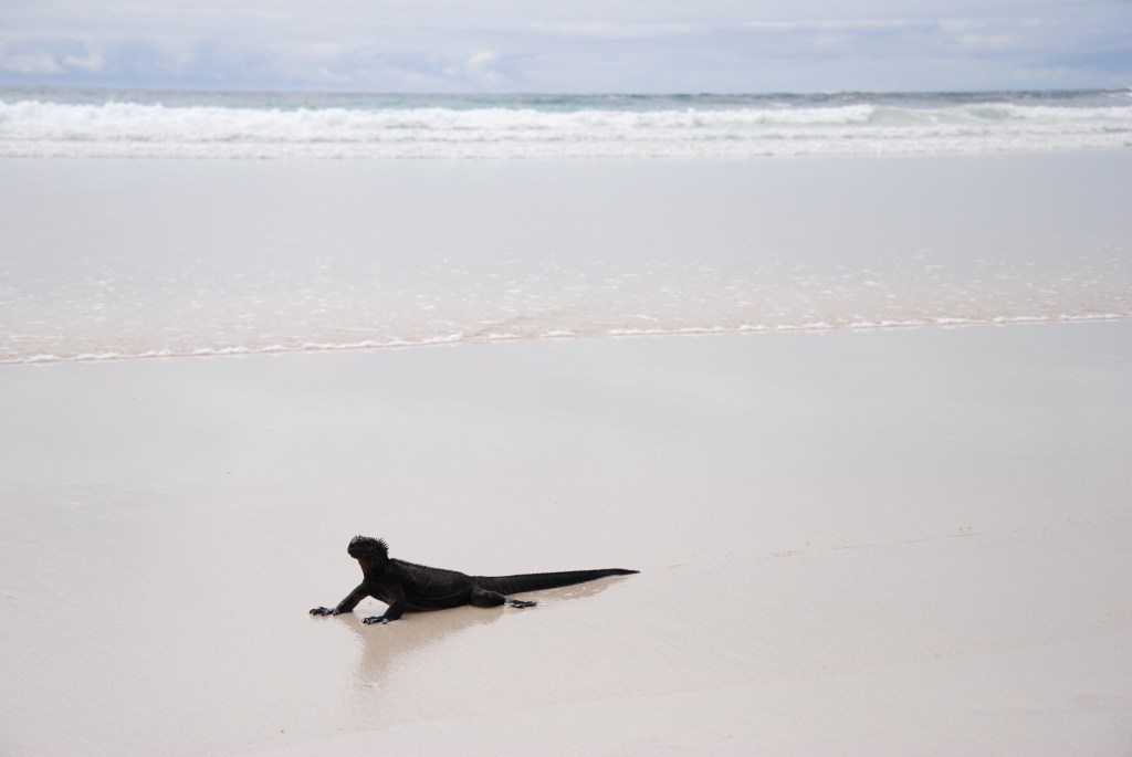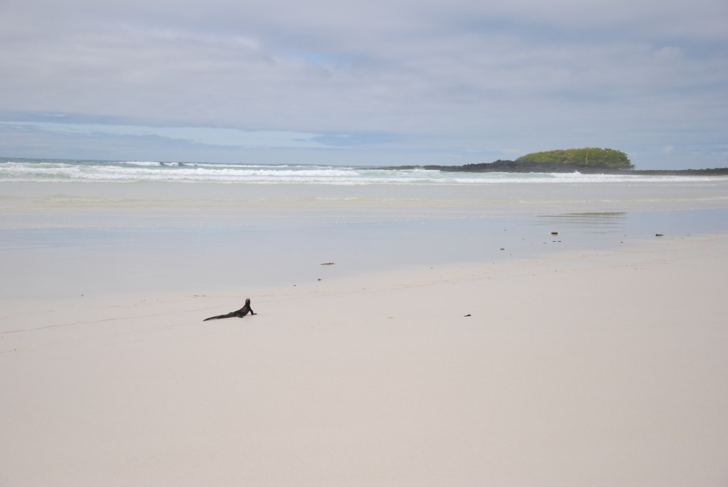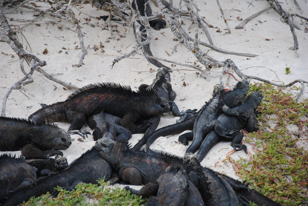 Plus loin, des iguanes marins dorment sur le sable, ou se laissent, impassibles, submerger par la marée. En me rapprochant de l’extrémité de la baie, ce sont des grappes entières de ces étranges reptiles qui paressent au soleil.