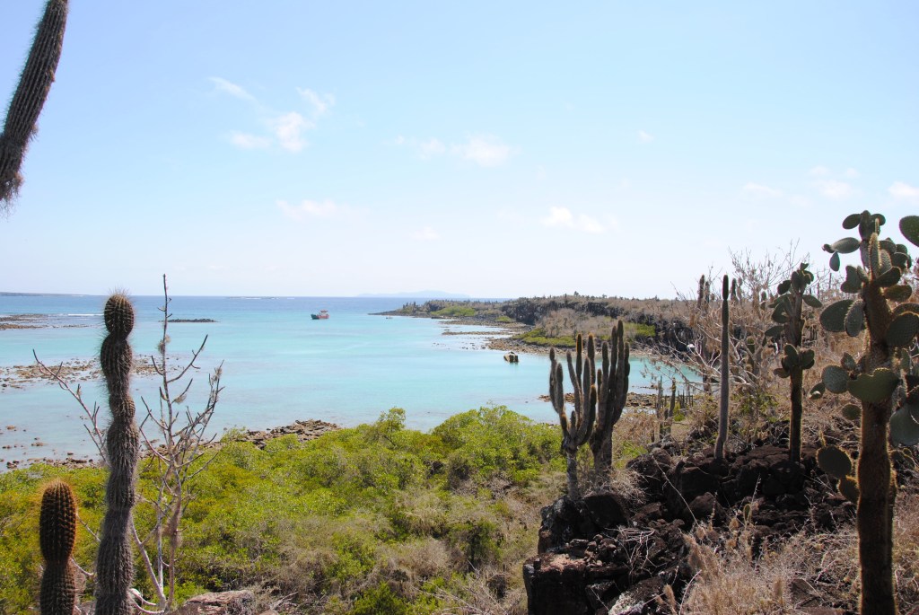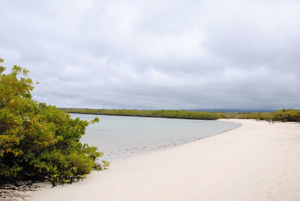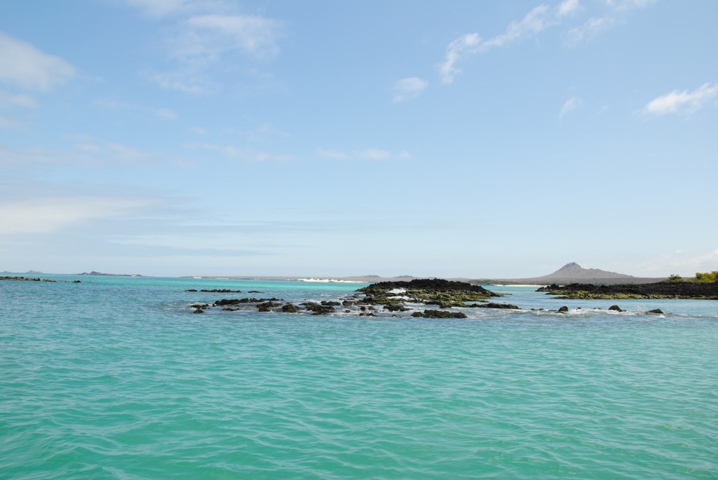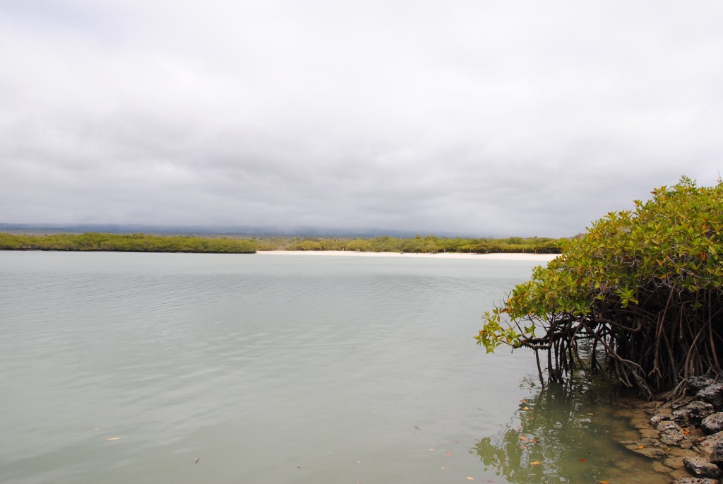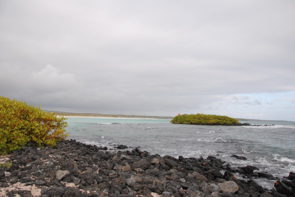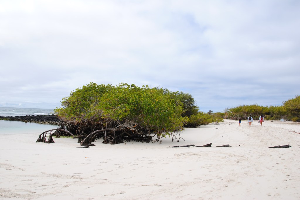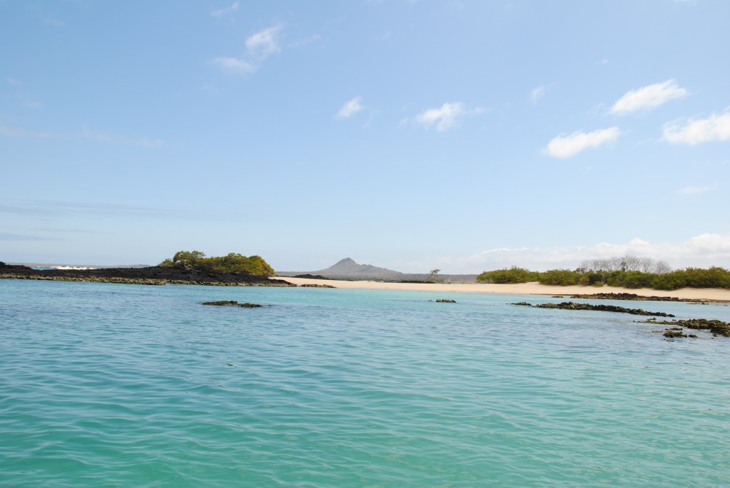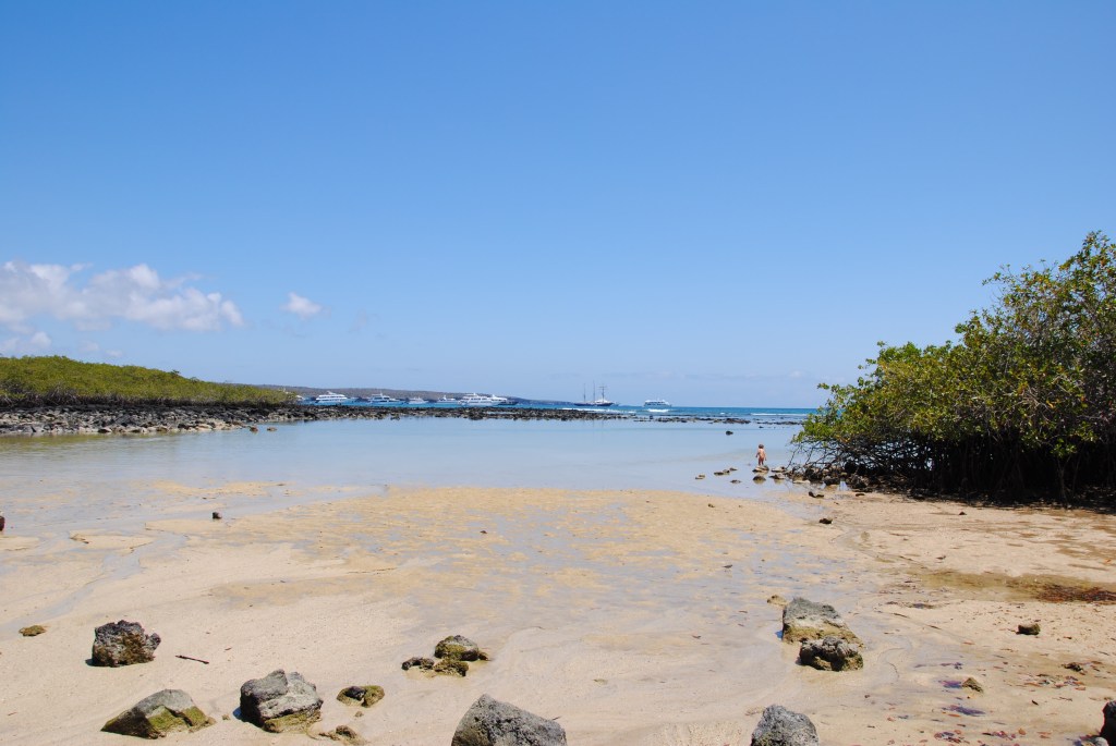 Mercredi matin, Puerto Ayora. Difficile de faire aussi intense qu’hier en terme de sensations…Mais je m’y attelle. Aujourd’hui, on ne change pas une équipe qui gagne, nous, les frenchies au complet, partons pour une excursion snorkelling à l’île de Pinzon, à l’ouest de Santa Cruz. Nous embarquons avec cinq autres personnes, un couple de Quito, deux amies (sœurs ?) de Baños, et un business man colombien. Plus le guide Leo et le capitaine bien sûr. Après une petite heure de navigation, durant laquelle Julie et Aurélien, à l’étage, aperçoivent quelques ailerons de requins des Galápagos (pouvant atteindre 4 mètres…), nous faisons un premier arrêt à l’Eden Beach, au nord-ouest de Santa Cruz. L’endroit est magnifique. Petite péninsule de sable et de rocher, parsemée de mangrove.