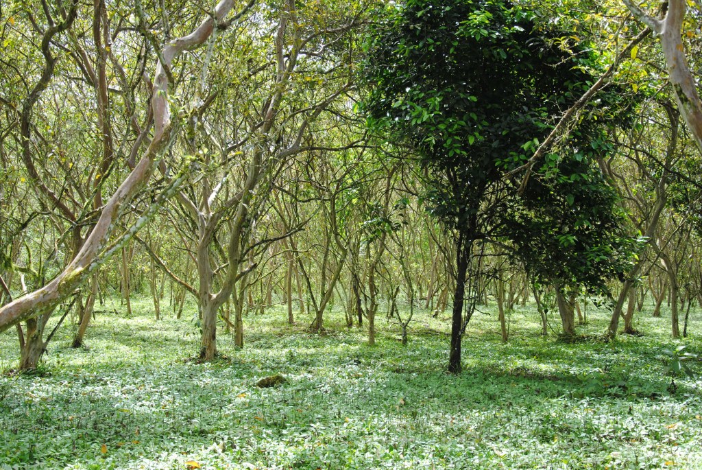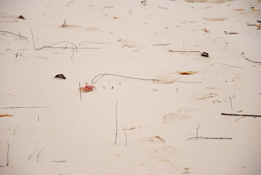 En tournant à droite au fond de la baie, je découvre un lagon entouré de mangrove, dont le calme contraste avec les courants de la baie. Sur la petite plage, des crabes rouges courent, latéralement, sur le sable fin.