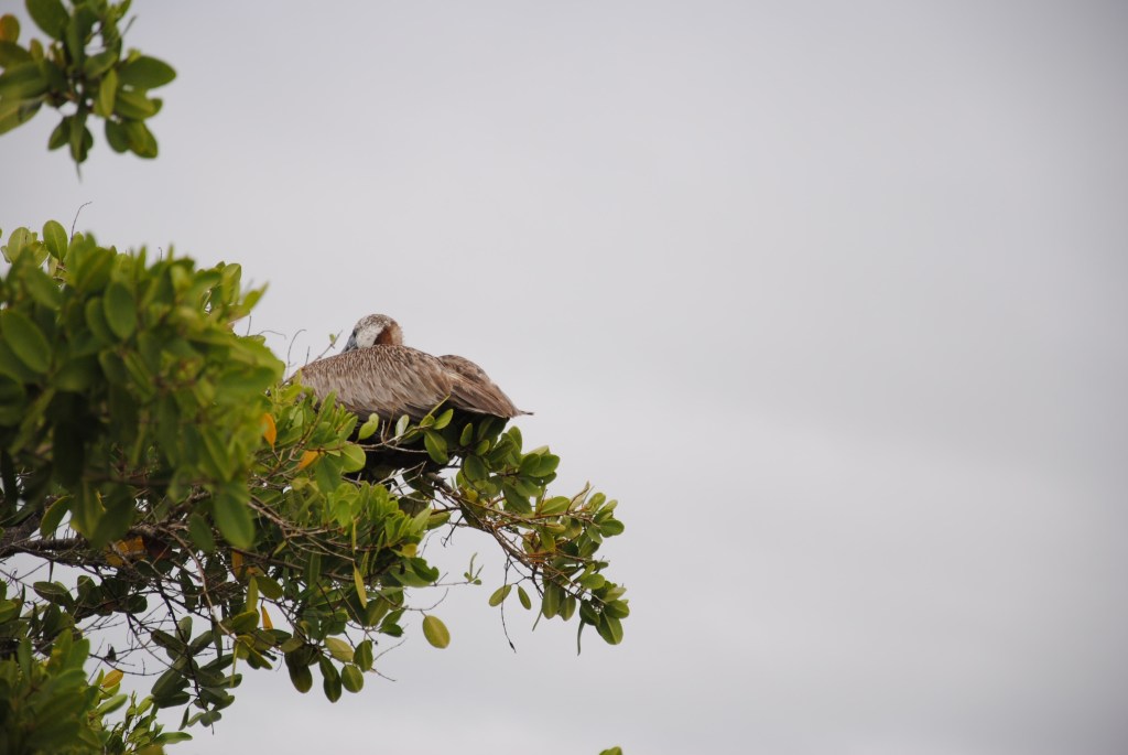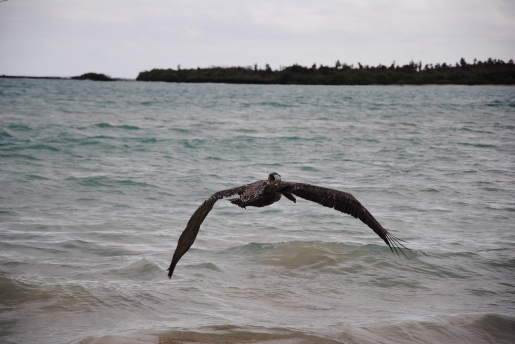 En revenant à l’entrée du parc, je croise (évidement) Sydney et Keith. Nous déjeunons ensemble en regardant les tortues mâcher langoureusement. Le charmant couple a quitté Chicago après leur retraite il y a trois ans, et depuis, ils voyagent. Tous les trois mois, ils élisent domicile dans un lieu différent : Séville, Lisbonne, Tel-Aviv, le Canada…Je reprends la route après cette agréable conversation, me dirigeant vers la “Playa El Garrapaterro”, ultime étape de mon bike trip. J’arrive vers 16h, éreinté par tous ces kilomètres et dénivelés…Mais l’endroit vaut le détour. Pas aussi imposante de beauté que Tortuga Bay, la plage a tout de même de beaux arguments à faire valoir : sable blanc, eau turquoise, mangrove, et vue sur l’Isla Santa Fe. Et puis j’arrive juste à l’heure du dîner des pélicans, qui tournoient au dessus des eaux et s’abattent comme des flèches sur leur proies.