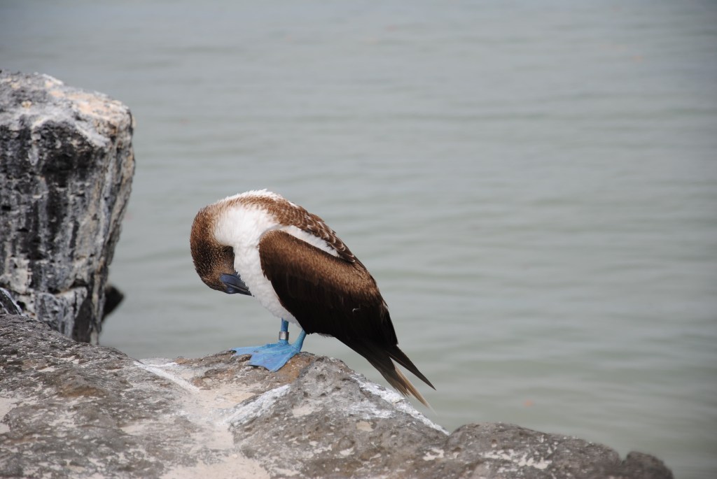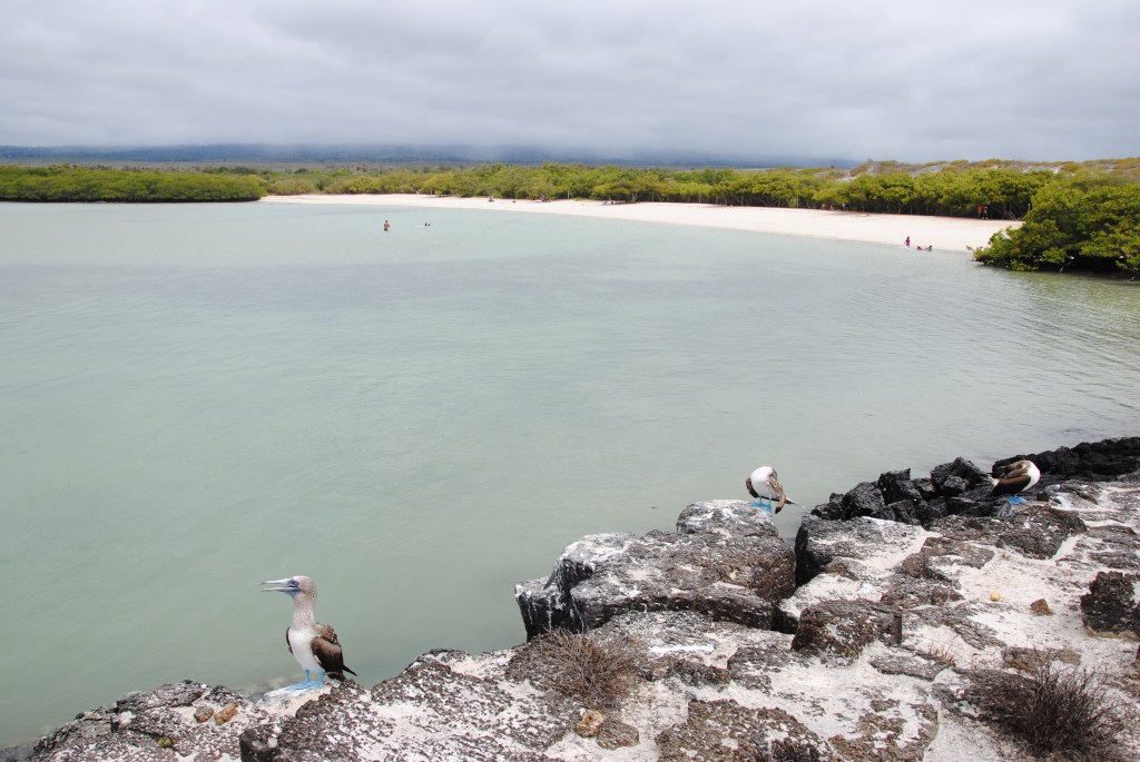 Je poursuis sur les bords du lagon et rencontre un trio de fous à pieds bleus. Eux aussi d’une effarante tranquillité. L’un se nettoie le buste. Un autre somnole. Le dernier se ventile la gorge, sans émettre un son.