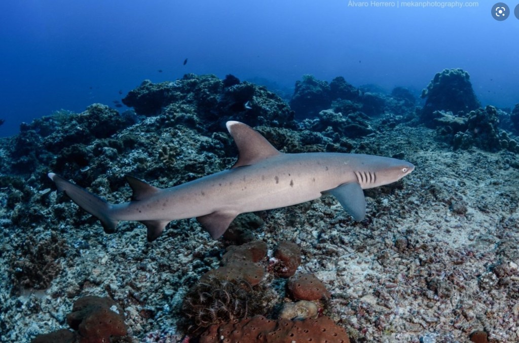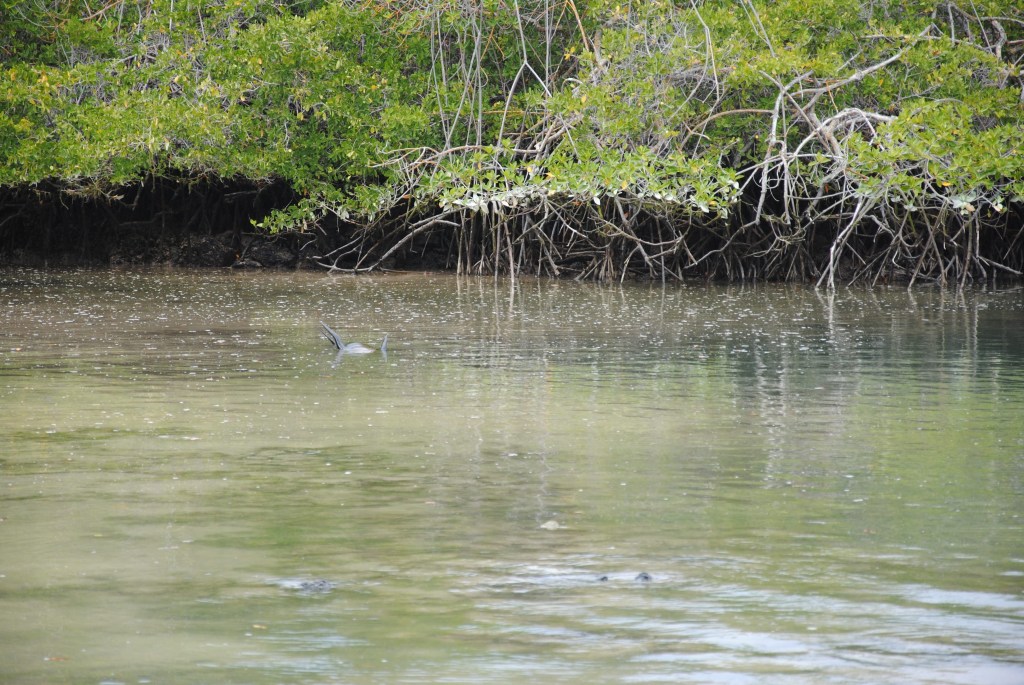Sur la berge, une bande de lions de mer nous observe, curieuse. Puis ils se jettent à l’eau et viennent nager autour de nous, joueurs. Quelle grâce ! Nous traversons l’anse en direction des zones très peu profondes qui embrassent la mangrove. Là, dans moins d’un mètre d’eau, nous flottons au dessus d’une bonne douzaine de requins à pointes blanches qui somnolent sur le sable. Ils font entre 1m et 1m50 de long et ont un air patibulaire. Inquiétant…Mais ils demeurent inoffensifs, et nous faisons chemin arrière pour retrouver le bateau.