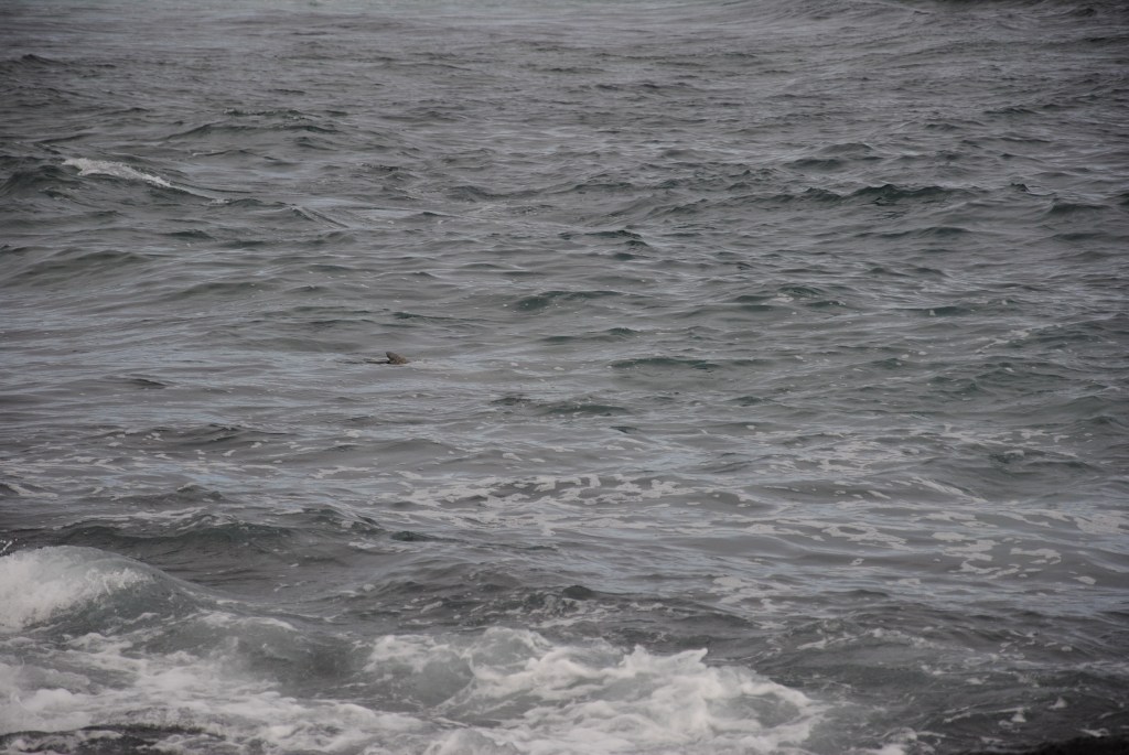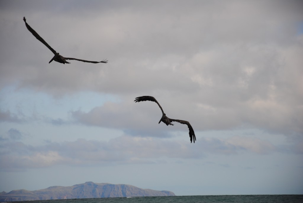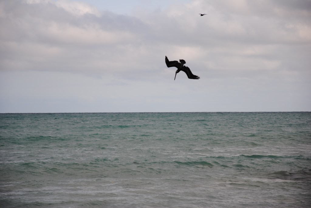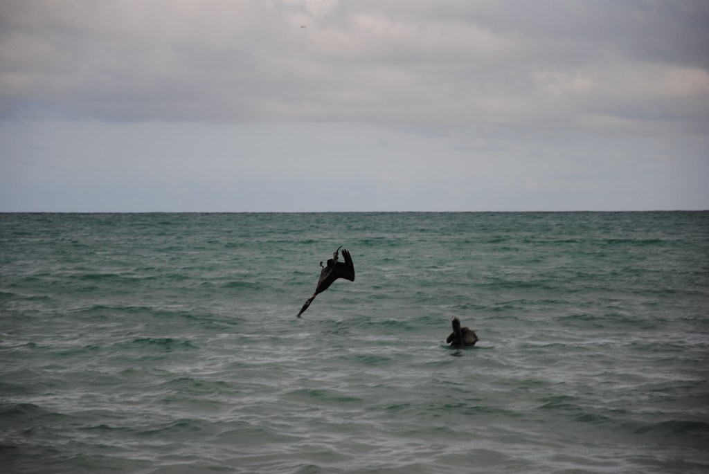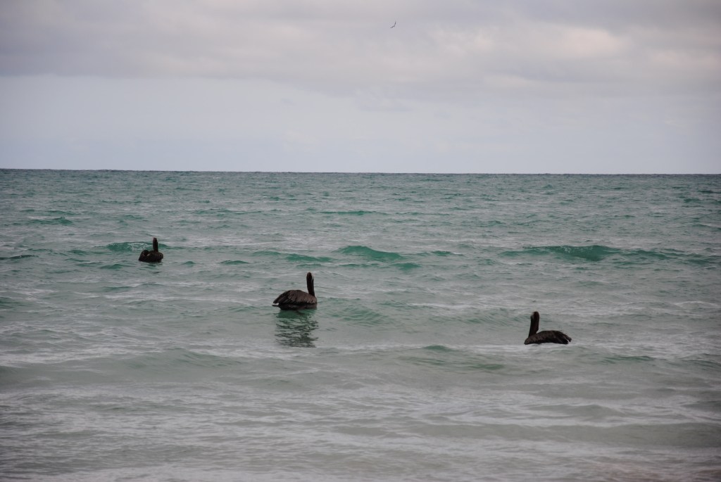 Des pélicans dérivent au gré du ressac, ou bien volent quelques mètres au dessus des vagues.