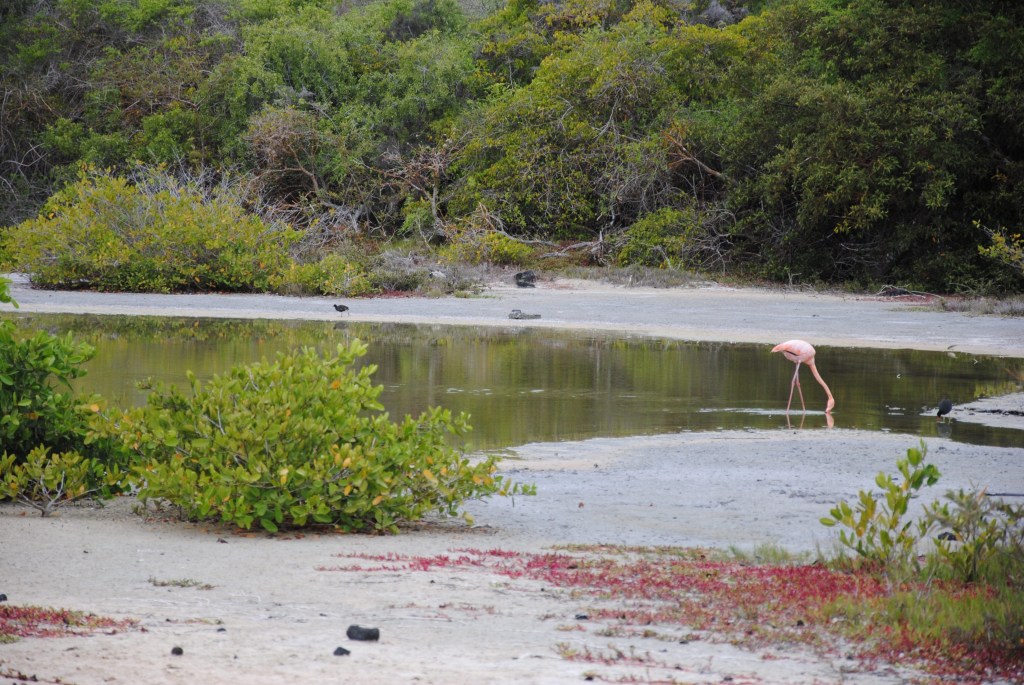 Je nage un instant dans la petite baie, puis il est temps de rentrer à Puerto Ayora. Avant de quitter la plage, nous faisons un court détour vers une lagune cachée derrière les arbustes. Là, un flamand rose sonde la vase en quête de nourriture. Je me dis alors que trois jours après avoir atterris ici, je n’ai rien perdu encore de ma capacité d’émerveillement.