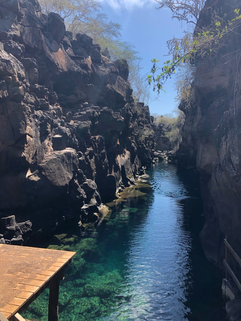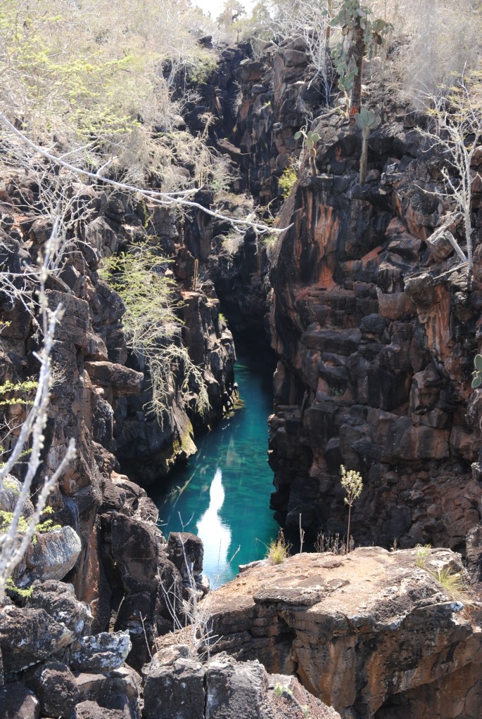 Lundi matin, Santa Cruz. Je me lève heureux, mais avec quelques symptômes tout de même de mon tour de l’île à vélo…Aujourd’hui, c’est détente. Je me rends dans la matinée sur le site de “Las Grietas” (les fissures), qui se trouve à quelques minutes de marche du port. L’endroit est magnifique : une faille au fond de laquelle brillent deux piscines naturelles. L’eau est cristalline, les bassins étroits et profonds (une dizaine de mètre). Et du bord de la faille, quinze mètres plus haut, on voit s’ébattre les poissons tant l’onde est limpide.