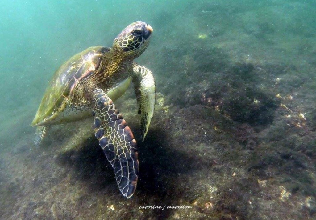 Sur le fond, cachée sous un rocher, je repère une large raie, que je montre fièrement à Julie et Aurelien. La chasse à la raie nous a fait sérieusement dévier vers la zone des requins des Galápagos. Nous rejoignons donc à la hâte le groupe, poussés par une légère montée d’adrénaline…Le guide nous emmène alors dans une petite anse, peu profonde, bordée de gros rochers noirs. Julie est la première a l’apercevoir. Une tortue broute nonchalamment les algues accrochées au rocher.
