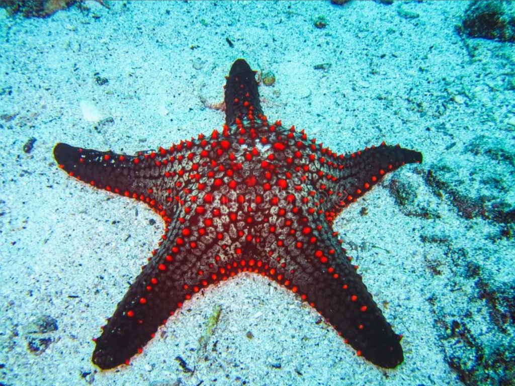Nous revenons vers l’îlot, où nous avons tout de même laissé Vincent et sa bande à 20 mètres de profondeur. Et, en attendant qu’ils remontent, nous enfilons combinaisons, palmes, masques et tubas pour une courte session de snorkelling. L’eau est froide ! Mais ce que nous voyons nous le fait vite oublier : des dizaines de poissons magnifiques affleurent les rochers ! Richard descend même réveiller gentiment un requin à pointe noire qui dort quelques mètres sous nos palmes. De gigantesques étoiles de mer rouges, jaunes, et bleues colorent ce merveilleux paysage sous-marin.