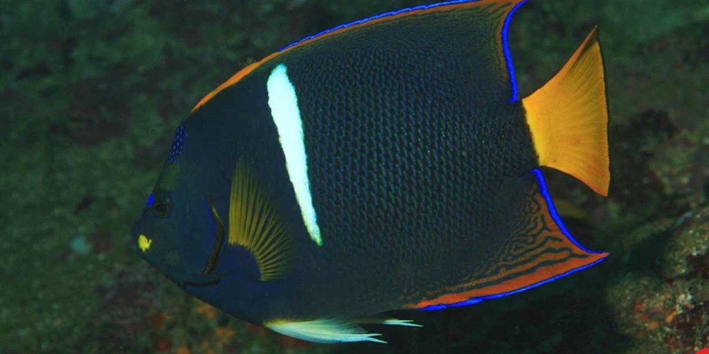 De l’autre côté de la péninsule, Aurélien a repéré une tortue qui nage non loin du rivage. Il se jette à l’eau dans l’espoir de la rejoindre. Mais l’eau est opaque et le vaillant nordiste perd l’animal dans le brouillard aquatique. Ce n’est que partie remise…Nous remontons à bord et déjeunons dans ce petit paradis d’eden beach, secoués par les vagues qui viennent mourir sur la plage. Puis cap sur Pinzon. Sur le trajet, je parle industrie pharmaceutique avec Mauricio, le colombien, qui est responsable des ventes Pour l’Amérique du sud chez Ferring. Nous atteignons notre destination en un tournemain, et c’est l’heure de retourner à la mer, en “open water” cette fois. L’eau est limpide. Et froide ! Il y a plus de fond aussi. On devine des fonds abyssaux à quelques dizaines de mètres de l’île à peine. Nous restons donc sagement à distance raisonnable, et progressons au dessus de gros rochers et bancs de sable blanc. La profusion de poissons est inimaginable ! Impossible de les recenser tous ici, je vous en nomme cependant quelques-uns : napoléon arc en ciel, poisson ange roi, tang jaune.