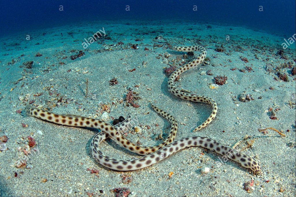 Non loin, un serpent de mer blanc taché de noir ondule sur le sable, face au courant.