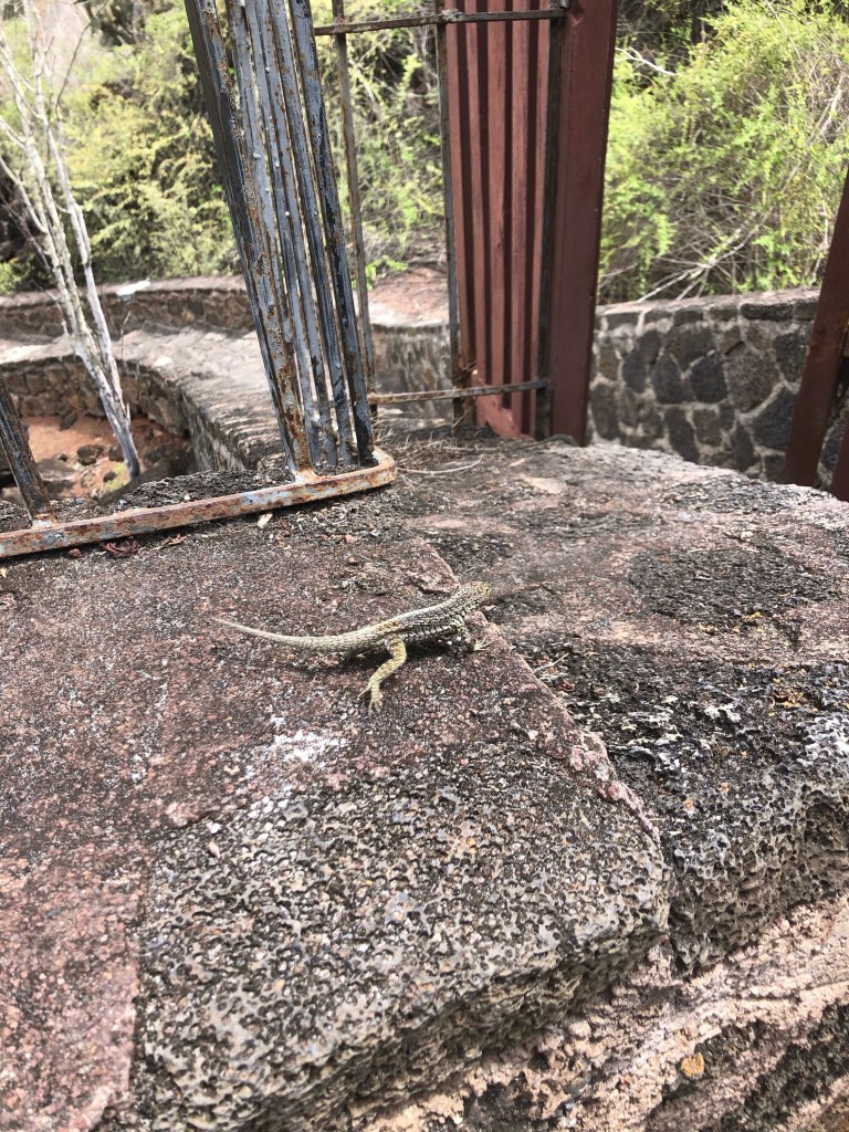 J’arrive à l’entrée du chemin, fait de jolies dalles brunes, au milieu de cactus et verdoyants bosquets. Les lézards ont colonisé l’endroit. Comme ici tout est différent, ils n’échappent pas à la règle : ils sont trapus et râpeux, comme de drôles d’iguanes miniatures.