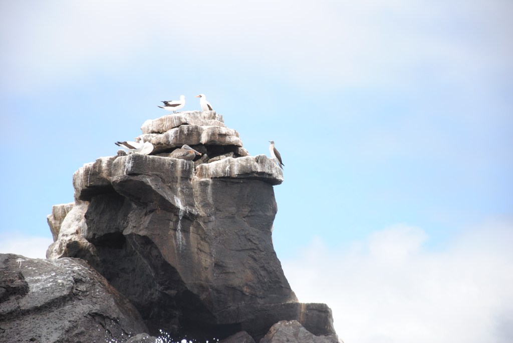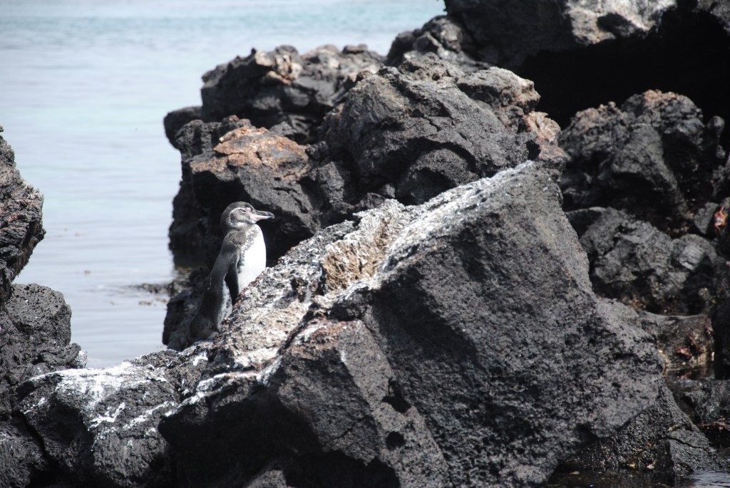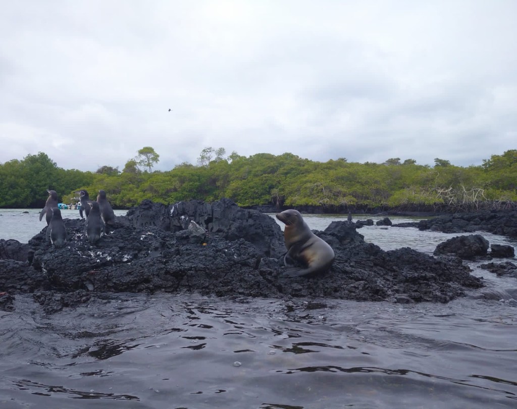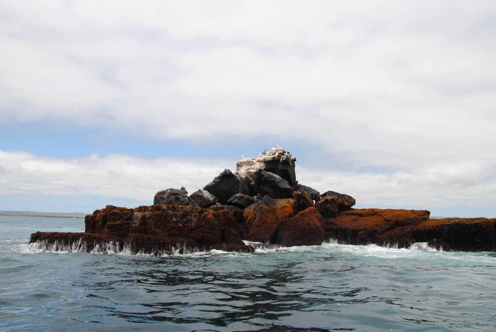 Quelques coups de rames suffisent pour admirer une très nombreuse colonie de fous aux pieds bleus, qui cohabite paisiblement avec deux petits pingouins. Plus loin, c’est toute une famille de ces énergiques oiseaux sous-marins qui trône sur son propre rocher. Jusqu’à ce qu’un rustre lion de mer vienne les y déloger. Ils sautent à l’eau l’un après l’autre, pas de taille à affronter la belliqueuse otarie.