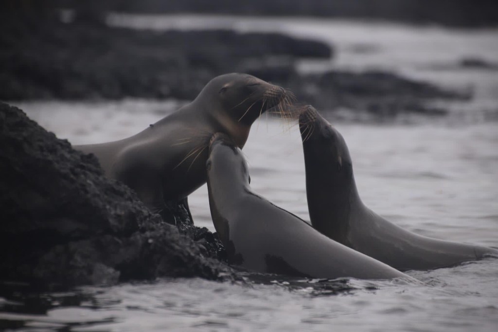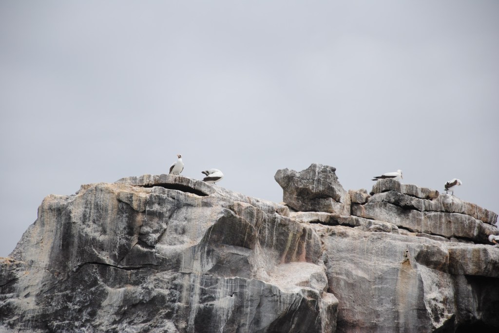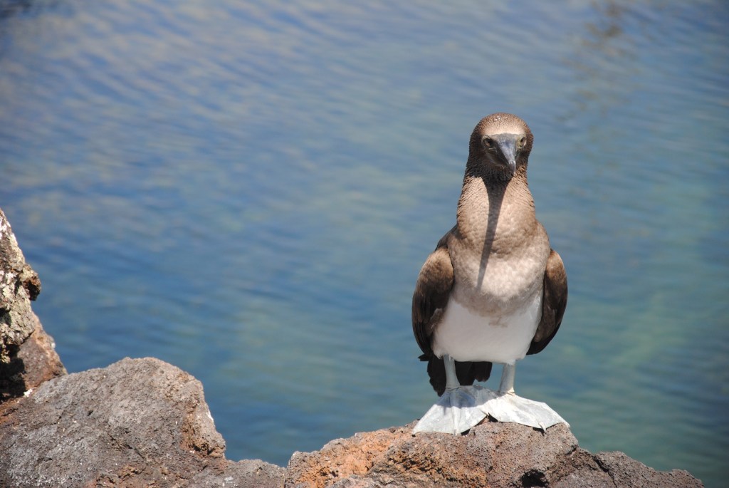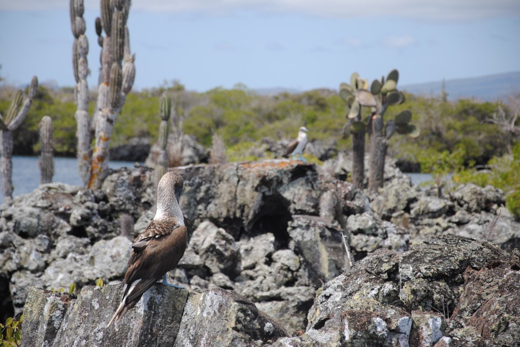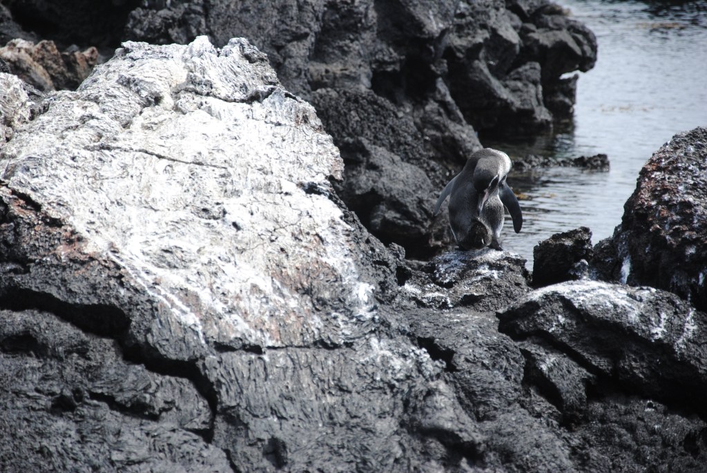 Quelques coups de rames suffisent pour admirer une très nombreuse colonie de fous aux pieds bleus, qui cohabite paisiblement avec deux petits pingouins. Plus loin, c’est toute une famille de ces énergiques oiseaux sous-marins qui trône sur son propre rocher. Jusqu’à ce qu’un rustre lion de mer vienne les y déloger. Ils sautent à l’eau l’un après l’autre, pas de taille à affronter la belliqueuse otarie.