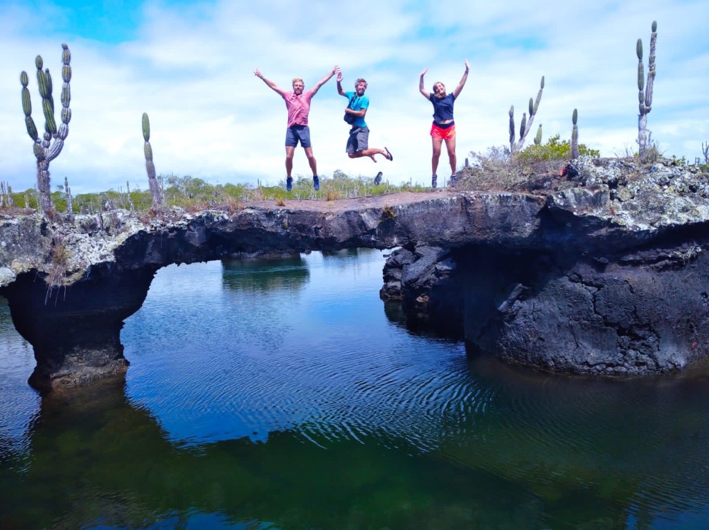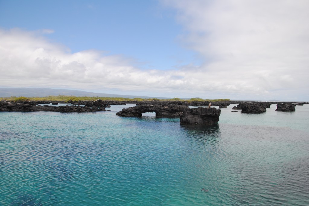 Dimanche matin, Puerto Villamil. Los Tuneles au programme aujourd’hui ! Mais le rendez-vous n’est qu’à onze heure. Ce qui me laisse pleinement le temps pour un bain matinal. Je nage longuement le long de la plage, balloté par les vagues. Soudain, entre deux longueurs de crawl, j’aperçois un homme vers le large, comme assis sur l’eau. C’est Aurélien sur une planche de surf, qui attend sa vague ! C’est drôle de se croiser comme cela…Je reste un moment à observer sa technique, tout en essayant d’attraper moi aussi les rouleaux. Le temps d’une dernière série accompagnée d’un petit lion de mer joueur, et Aurélien me rejoint sur la plage. Le rendez-vous pour Los Tuneles approche, nous cheminons ensemble vers le village. A l’embarcadère, nous faisons la connaissance de notre équipage du jour : Carlos, le guide, Carolina et Olivier, jeune couple franco-colombien, et un canadien de Vancouver avec sa fille de sept ans. Ce dernier va s’avérer une attraction parallèle au tour. Le bateau se met en route vers le sud de l’île et le merveilleux site de Los Tuneles. En chemin, nous apercevons quelques gigantesques raies manta (dont un spécimen de 4 mètres d’envergure) qui sautent de part et d’autre de l’embarcation. Nous faisons une courte halte aux abord de l”union rock”, un cailloux posé dans l’océan où se reposent d’élégants fous nascas.