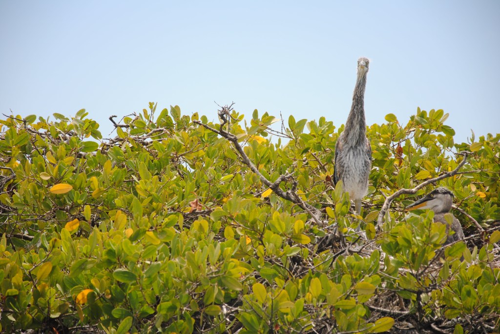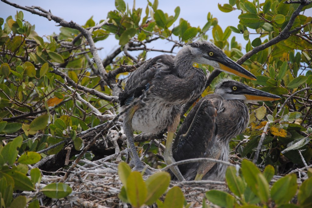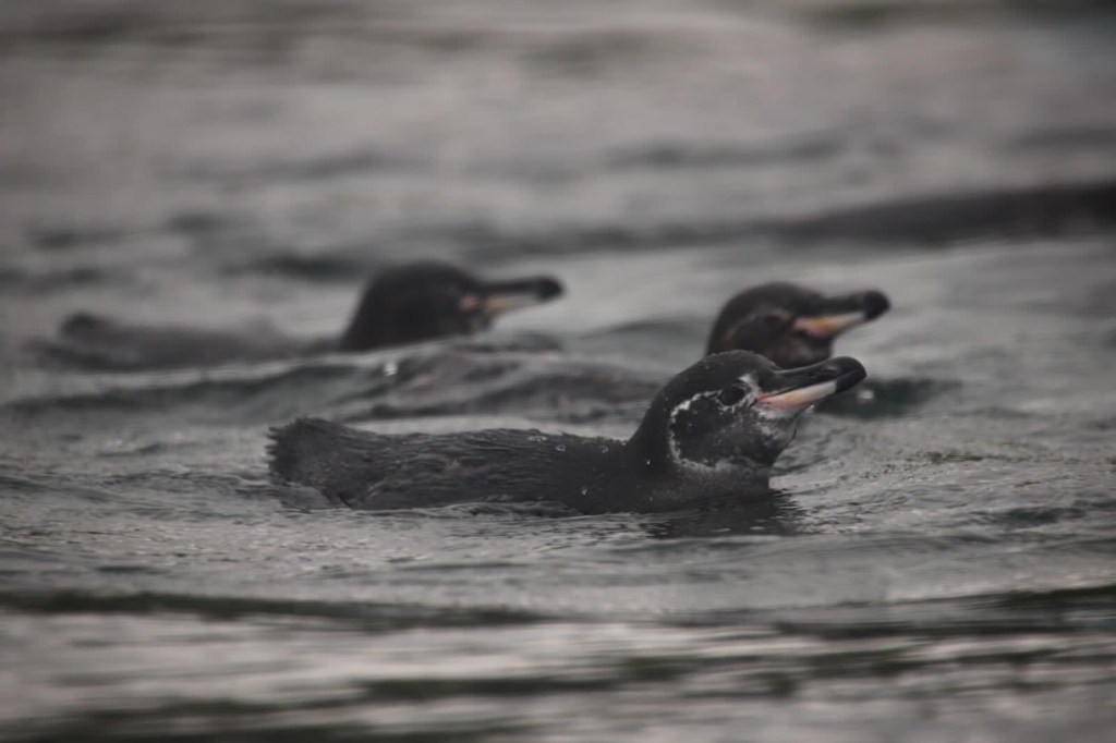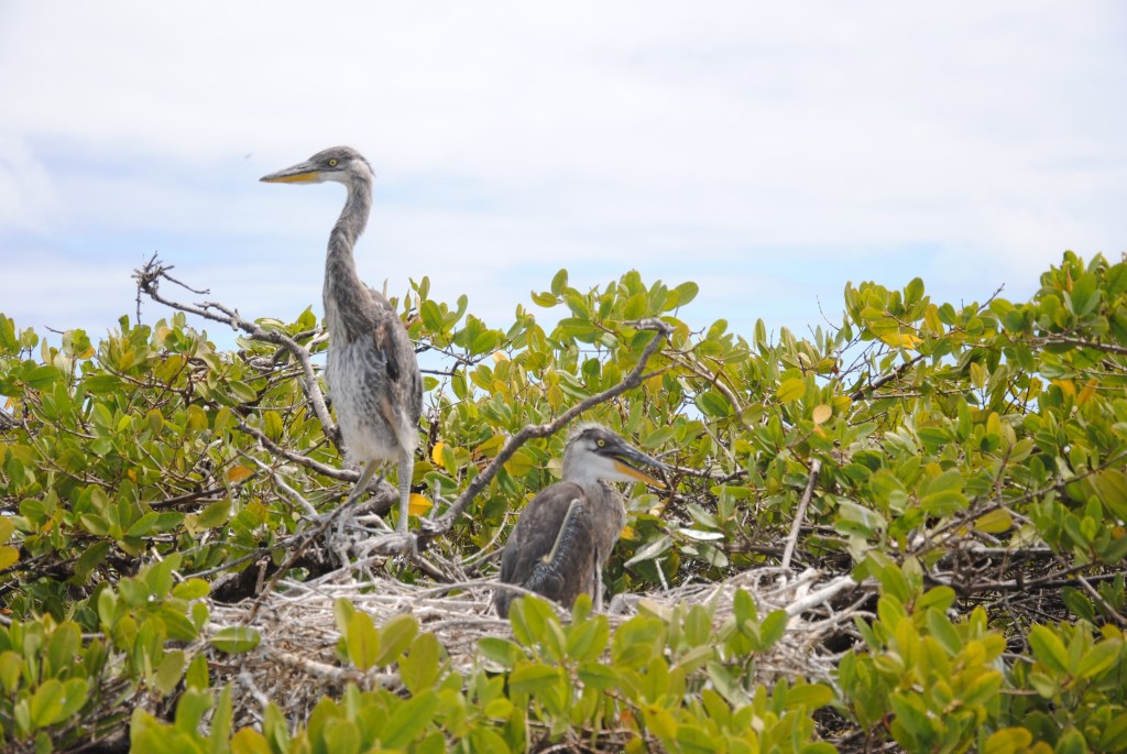 Sur le pont avant (à l’abri du canadien, retenu à l’arrière par notre courageux guide), nous sommes aux premières loges pour admirer ici un minuscule pingouin des Galápagos qui se sèche au soleil, là un nid dans la mangrove où deux jeunes hérons bleus attendent que leur parents rapportent le déjeuner.