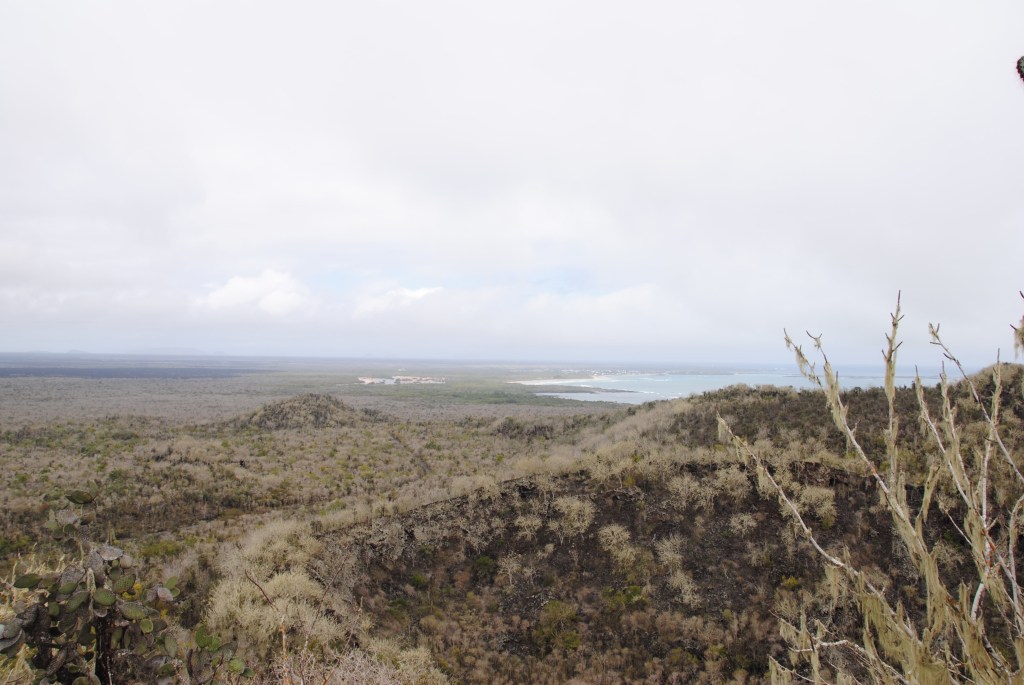 Malgré tant de superbes détours, j’arrive à destination. Je me recueille un instant devant le triste ouvrage, puis grimpe jusqu’au point de vue, qui offre un très vaste panorama, sur la plage de Puerto Villamil à l’est et les volcans au nord. Le temps couvert estompe les couleurs, mais le paysage n’en demeure pas moins grandiose.