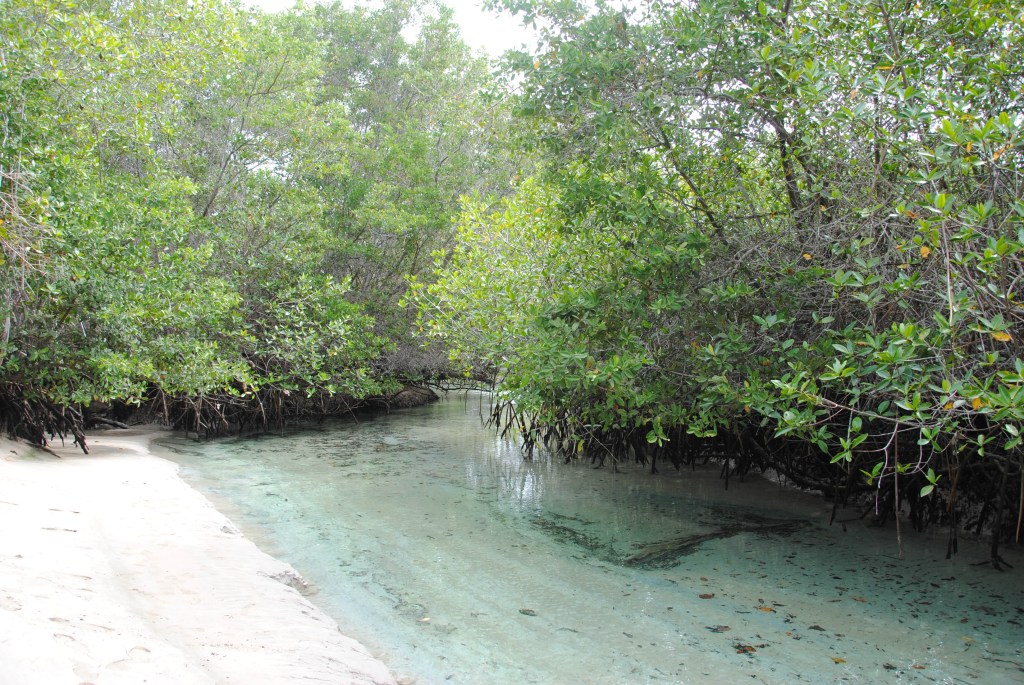 Un autre chemin mène au cœur de la mangrove, à un paysage époustouflant de beauté. Ces racines qui s’entremêlent avant de plonger dans une eau claire. Ces feuilles jaunes et rouges qui flottent à la surface. Le bruit lointain du ressac. Un charme fantastique opère ici.