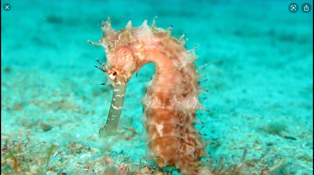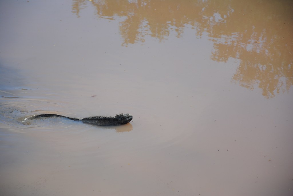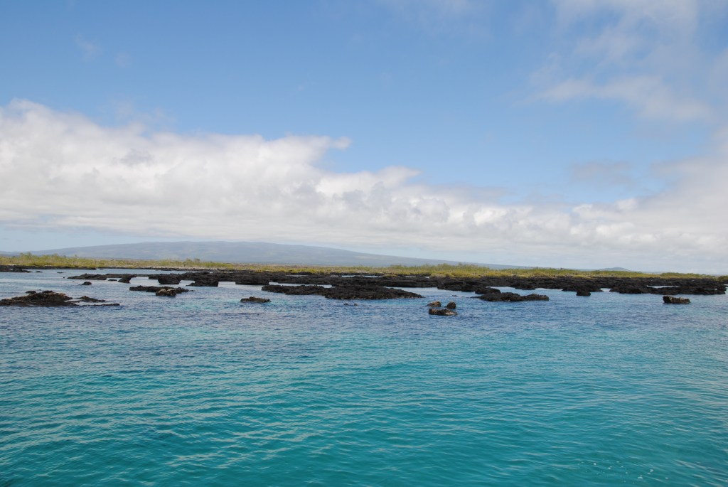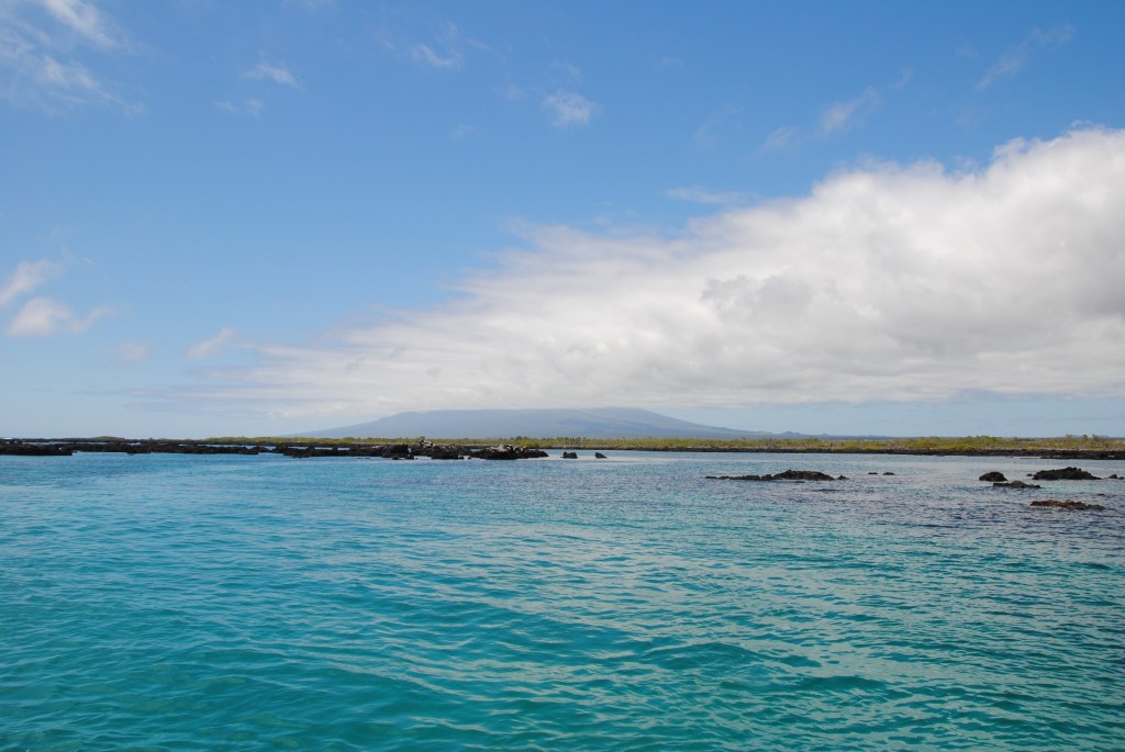 Nous remontons à bord pour se diriger vers le site de snorkelling, à deux pas. C’est le moment que choisi le vilain canadien pour fondre sur notre guide avec une agressivité peu croyable. Monsieur veut aller à l’eau et en a marre de ronger son frein. Le tout dit dans un language fleuri sous les yeux de sa petite fille de sept ans. Fort heureusement, l’eau fraîche calme le bougre et la balade sous marine peut commencer. L’eau est peu profonde, nous progressons entre bancs de sable et dédales de rochers. Au creux d’un d’entre eux nous découvrons une créature fantastique : un gros poisson jaune-orange vif à la face plane et au corps comme atrophié : c’est une variété rare de “puffer fish” (poisson porc-epic ou poissons globe). Puis c’est un festival de tortues : un groupe de six individus, petits et grands, sont réunis pour un festin d’algues autour d’un amas de rochers. Plus loin, cachés dans les grottes créées par la lave, des dizaines de requins à pointes blanches se reposent sur le sable. Aidé par Carlos, je me glisse dans la grotte et reste un instant suspendu au dessus d’un spécimen d’un bon mètre cinquante, sous le regard de ses congénères, entrelacés dans le fond de la cavité…Ces poissons tueurs aux yeux fuyants et aux petites dents acérées exercent sur moi un puissant magnétisme. Carlos me tire hors de la grotte et nous poursuivons notre chemin vers la mangrove, pour une dernière surprise. La queue accrochée à un morceau de bois tombé au fond de l’eau, un hippocampe ondule avec le courant. Quelle étrange bestiole !