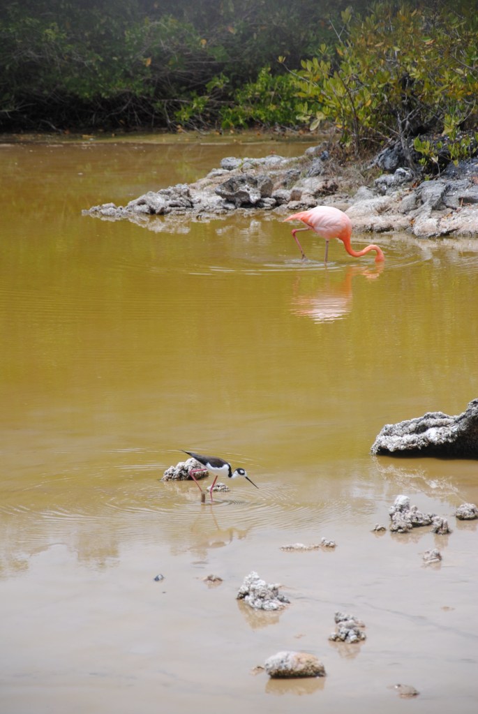 Samedi matin, hôtel La Jungla. La journée commence tôt, car j’ai promis à Jenny, responsable d’une agence touristique en ville, de venir lui régler l’excursion du lendemain avant 8h. En effet, j’ai œuvré les deux derniers jours pour organiser la visite des deux pépites de l’île, le site de snorkelling de Los Tuneles, au Sud, et l’ascension du Volcan Sierra Negra, au cœur des hautes terres. Ce qui n’a pas été si simple en ces temps de pandémie où la plupart des agences sont fermées. Je suis donc ce matin en train de payer mon dû pour le voyage à Los Tuneles prévu demain Dimanche. Le volcan est lui au programme du Lundi. A 10h, je retrouve Julie et Aurélien, qui sont arrivés la veille dans des circonstances rocambolesques, sur la place centrale du village. Ils seront de la partie pour Los Tuneles, et peut être aussi pour le volcan Lundi. Je leur donne quelques conseils sur les choses à voir dans les parages, partageant particulièrement mon enthousiasme pour la concha perla. D’ailleurs, ils s’y rendent tandis que je me dirige vers un centre d’élevage de tortues géantes au nord du Village. Le sentier pour s’y rendre passe au travers de jolis lagons, où se nourrissent de superbes flamands roses. Quels majestueux oiseaux !