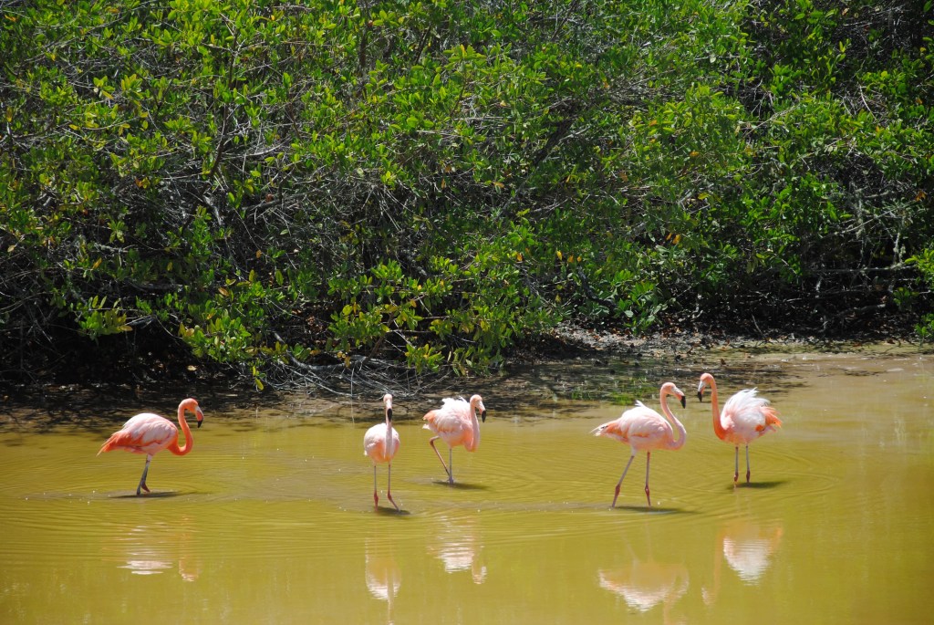 Je fais demi tour, salue au passage les flamands, réunis en cercle dans une sorte de conciliabule, enjambe quelques iguanes dormant sur les passerelles, et atteins mon hôtel.