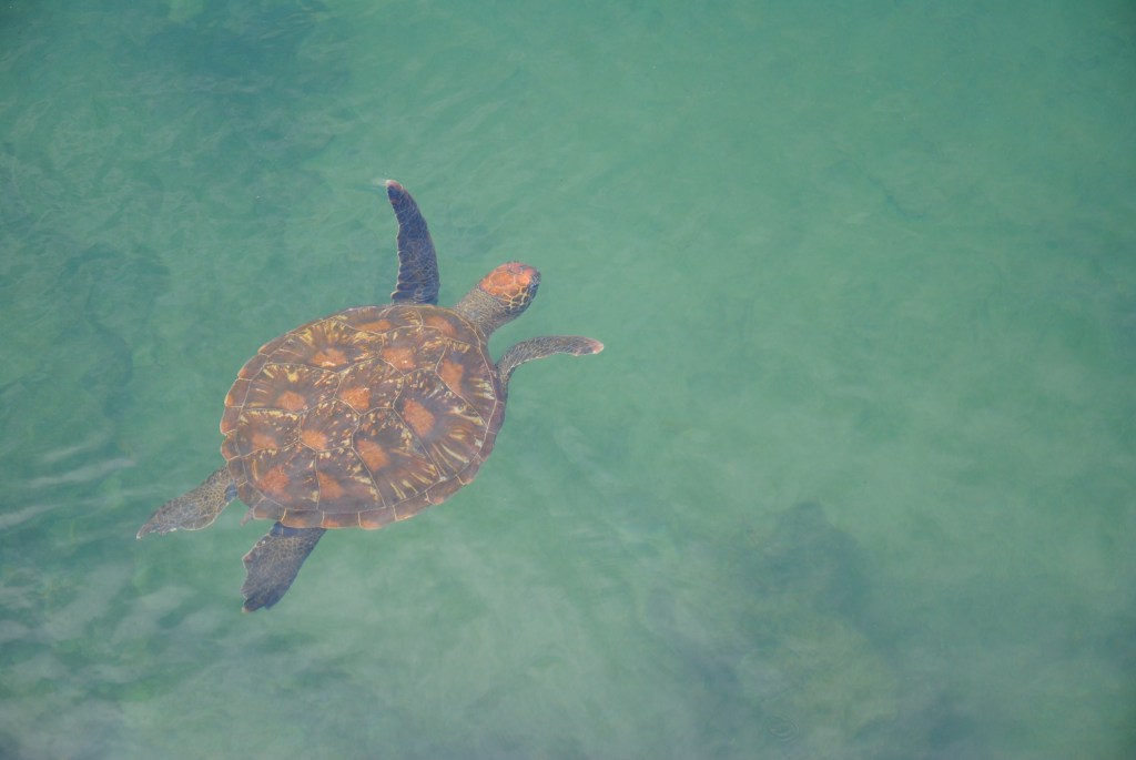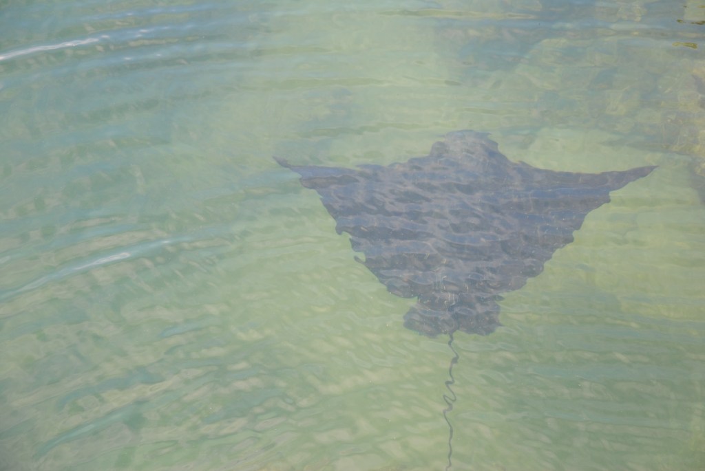 Ils me laissent aux portes du chenal, véritable carrefour sous marin où se mêlent de multiples espèces de poissons. Là, mâchouillant les rochers, une grosse tortue de mer nage contre le courant, la bouche pleine. Résistant moi aussi au courant qui me pousse vers le port, je reviens au milieu du bassin. Je suis bien inspiré car je vais y faire de fabuleuses rencontres. Une tortue de mer sort sa petite tête de l’eau, puis plonge. Je la suis longuement, hypnotisé par la volupté de ses mouvement. Un coup d’œil à droite et j’aperçois un escadron d’une douzaine de raies léopards quelques mètres plus bas. Je quitte ma tortue et nage au dessus de ces graciles poissons ailés, dont les points blancs scintillent au soleil. Le groupe se sépare, je reste en filature sur la plus grande. Elle me mène vers le fond, où une raie épineuse se cache dans le sable. Non loin, un poisson porc-épique me regarde de ses gros yeux excentrés, alors que réapparaît ma tortue. La boucle ainsi bouclée, je retourne sur le ponton, émerveillé.