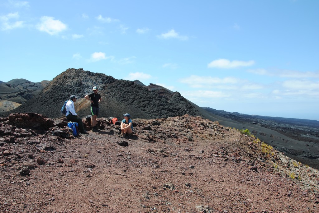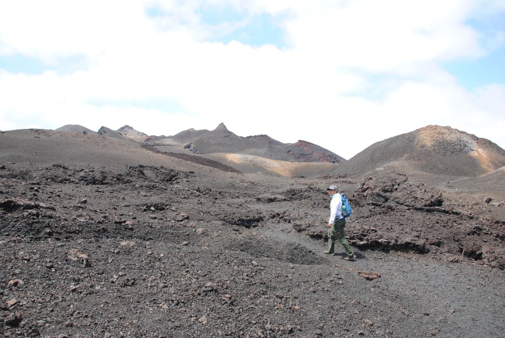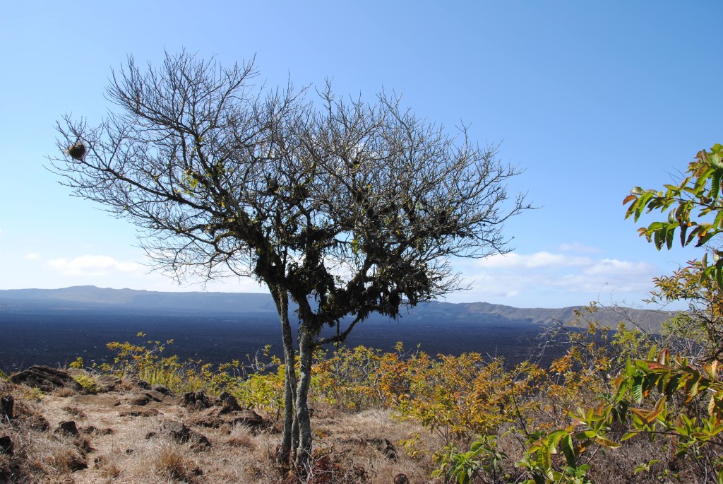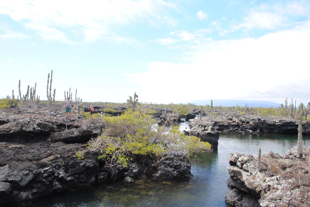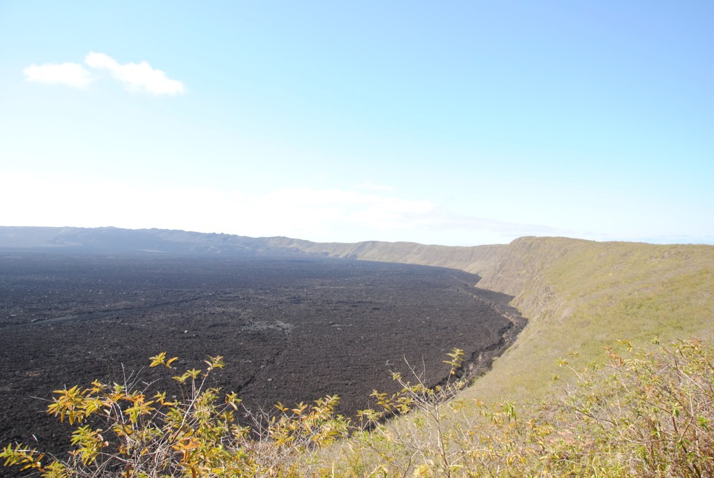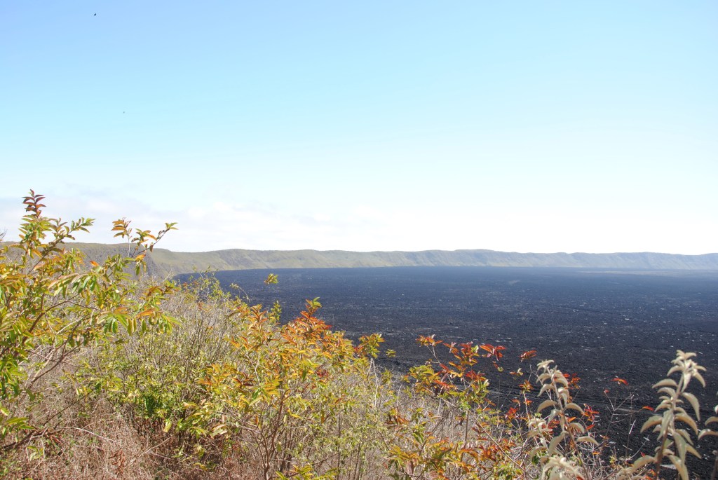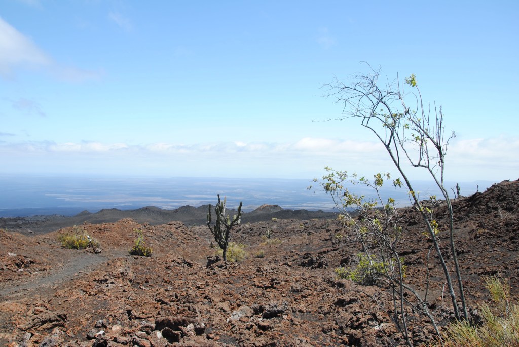 À demi convaincus malgré son professionnalisme, nous poursuivons notre route vers le volcan Chico et la plaine volcanique. Et effectivement le ciel se dégage. Le paysage est époustouflant : en contrebas, nous voyons se dessiner les contours d’Isabella, formant un hippocampe géant, l’étroit isthme de l’île en guise de fine taille. De notre perchoir à l’isthme, la plaine volcanique, presque nue, étire son sol noir et ocre craquelé sur des kilomètres.