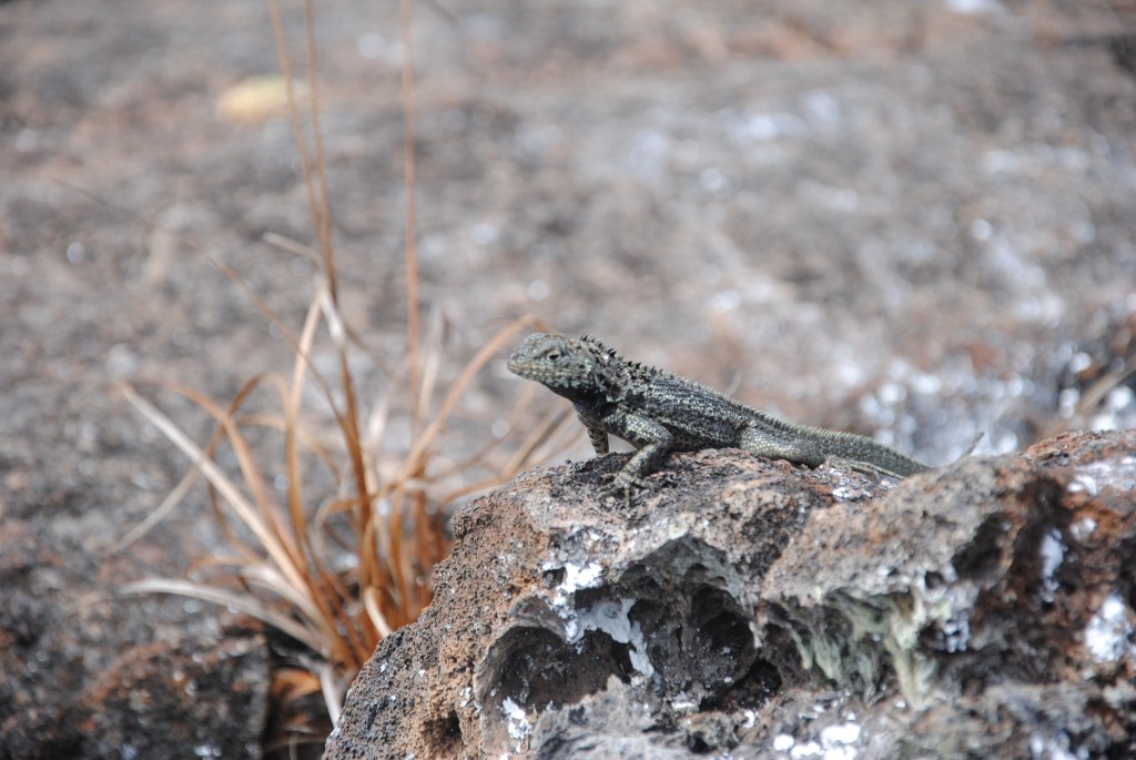 Mes bagages posés, je ressens le besoin de me dégourdir les jambes après la traversée agitée. Cela tombe bien, le sentier du “Muro de Las lacrimas (le mur des larmes), commence pratiquement sous mes fenêtres. Un peu d’histoire : au milieu du siècle dernier, Isabela a hébergé un pénitencier, essentiellement pour prisonniers politiques. Et ces derniers ont subis toutes sortes de sévices, la prison étant gérée par des tortionnaires sanguinaires et vicieux. Le mur des larmes, gigantesque et vain empilement de pierres volcaniques est le dernier vestige de la geôle. Il s’érige aujourd’hui autant en monument à la mémoire des hommes ayant souffert et péri ici qu’en rappel salutaire des outrages générés par la cruauté humaine. La route chemine sur sept kilomètres, entre plages et lagons. De très nombreux pinsons de Darwin virevoltent dans cette végétation grise et vert pâle typique des Galápagos. Très vifs, ils sont durs à capturer en photo.