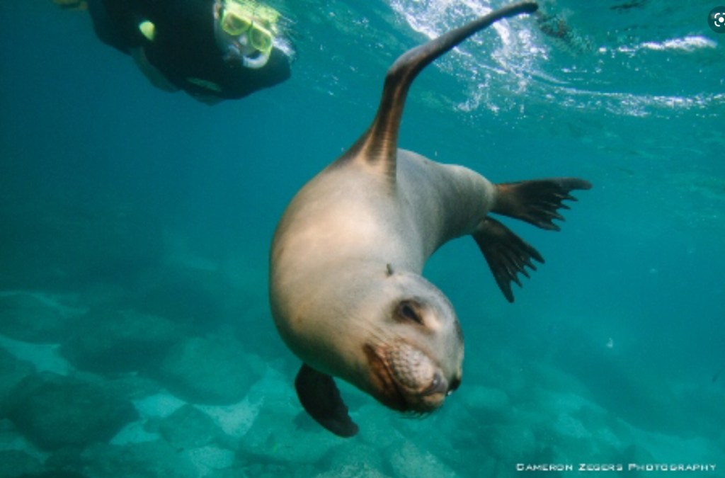 Ma deuxième baignade est magique. Absolument merveilleuse. J’accumule les superlatifs dans le seul but de me rappeler longtemps les sensations submergeantes ressenties pendant cet incroyable moment. Déjà, à peine dans l’eau, deux petits lions de mer improvisent une dance autour de moi. Ils virevoltent de tous côtés, me frôlent avant de repartir puis reviennent en ce croisant.