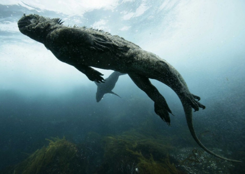 Nous accostons dans une baie improvisée, formée par une bande de rochers circulaires, et amarrons nos kayaks. Nous enfilons palmes et masques pour explorer les dessous de Las Tintoreras. Les tortues sont légions dans ces parages ! Ce doit être l’heure du dîner car toutes sont accrochées aux rochers, arrachant les algues brunes et ne s’en éloignant que pour brièvement respirer à la surface. Entre les rochers, nous apercevons une pieuvre, malgré ses étonnants efforts de camouflage, mais elle se tapit dans son trou lorsque nous nous approchons pour l’admirer de plus près. D’agiles serpents de mer, beiges à points noirs, se faufilent entre sable et cailloux. Andrès attire ensuite notre attention sur une scène surréaliste. Un iguane est accroché au rocher, par 1m50 de fond, et il broute lui aussi les algues attenantes. Un micro-dragon qui paisse comme une vache, et sous l’eau, les Galápagos n’ont pas fini de nous surprendre. Image invraisemblable ! L’iguane remonte alors élégamment à la surface, face vers le ciel, en ondulant sa longue queue dentelée. Exactement comme dans la scène qui ouvre le fabuleux film “Océans” de Jacques Perrin.