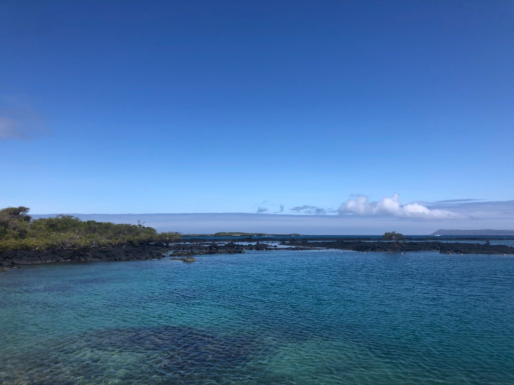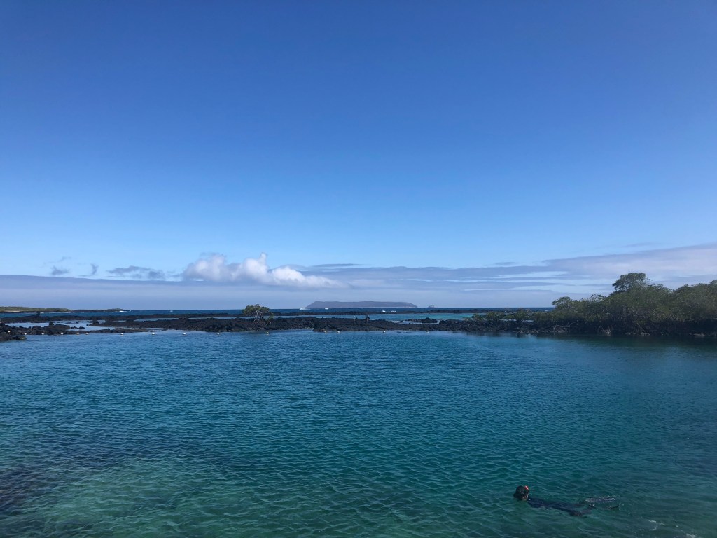 J’ai le plaisir d’y retrouver la sympathique famille croisée la veille sur la route du mur des larmes. Le petit Matteo, sept ans, se jette sur moi, tres affectueux. Jefferson, l’aîné, m’impose une session selfies pour garnir son Instagram. Et la maman, joviale, me noie dans un flot de paroles dont je ne comprend qu’une infime partie. Je fais par ailleurs la connaissance de Gene, un plongeur australien amateur. Il ne tarît pas d’éloges sur le lieu, et, en connaisseur, me fait part de l’existence de deux épatants habitants, intermittents, du bassin : une tortue de mer géante, et un petit pingouin des Galápagos. Mon troisième bain est tout entier dédié à leur recherche. Mais je me laisse à nouveau distraire par les tortues, lions de mer, et autres raies, et reviens bredouille. Je bronze un instant en observant le dialogue étrange entre deux lions de mer bougons et un gros iguane marin qui éternue bruyamment. Un dernier bain, un ultime câlin avec Matteo qui me fait un shampoing scout, et je quitte ce paradis aquatique. Je regagne mon hôtel, heureux. Lecture, écriture, quelques emplettes en ville, puis je me prépare un steak d’espadon avec les moyens du bord. La journée a été tellement belle que s’en est étourdissant. Ce soir, je rêverai à nouveau en bleu.