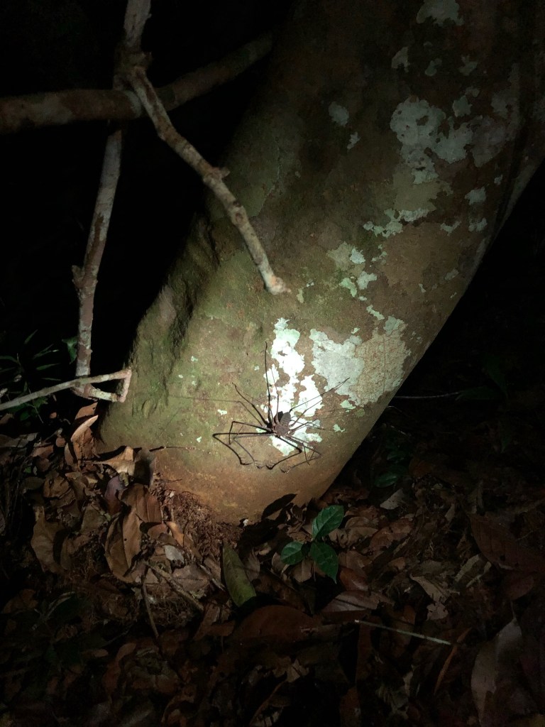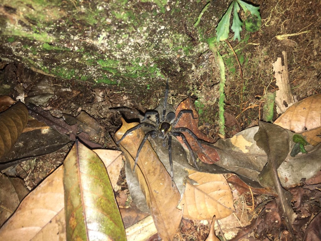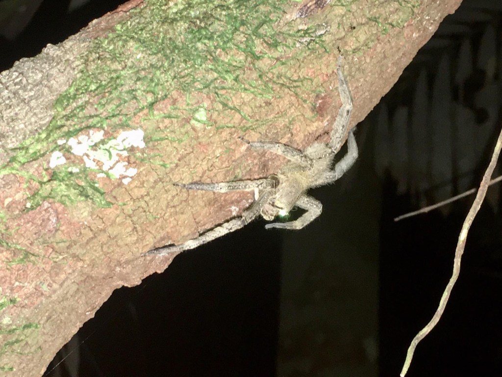 La journée a été riche en émotions ! Mais ce n’est pas terminé, puisque Jacob improvise une marche nocturne sur le sentier qui part du fond du lodge. De nuit, la forêt devient mystique, inquiétante. L’imagination remplace la vision, et, troublés par l’onirique musique de la jungle, nous voyons surgir de l’obscurité les monstres de nos cauchemars. Mais au-delà de nos sombres rêveries, la jungle ne tarde pas à révéler sa face cachée, bien réelle. D’abord, c’est une araignée scorpion brunâtre au bas d’un tronc qui exhibe sa vingtaine de centimètres de diamètre.