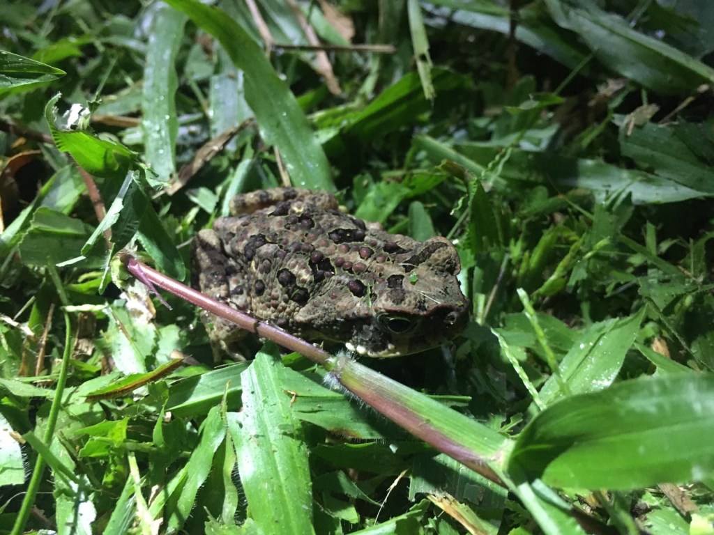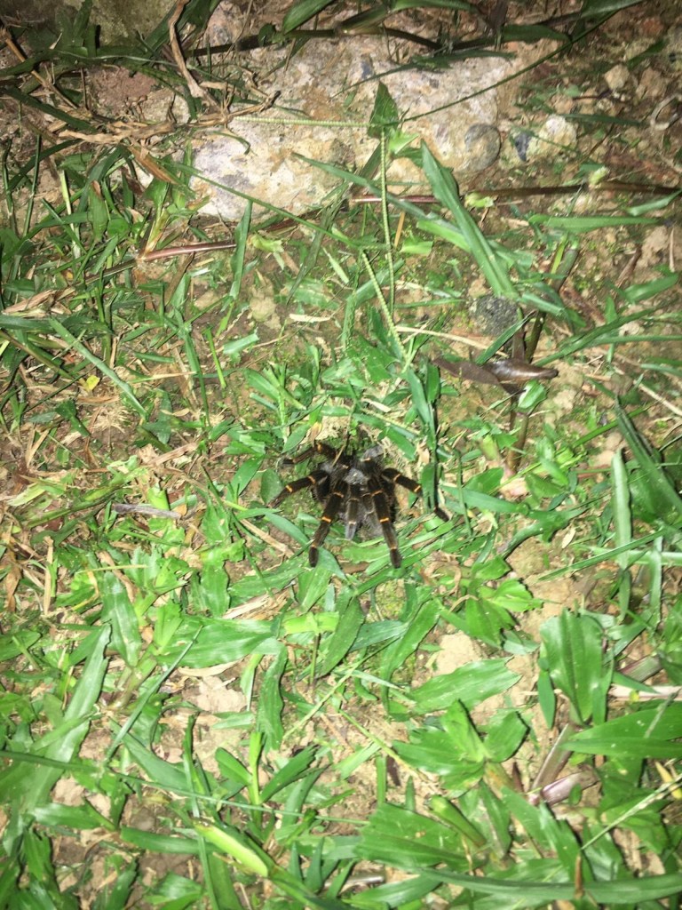 Devant les premières huttes, et avant d’aller tacher de dormir malgré les monstres qui rôdent tout près, nous saluons un petit crapaud et une tarentule en pleine chasse. Quelle incroyable journée !