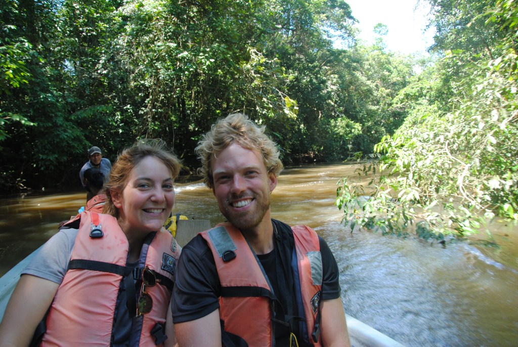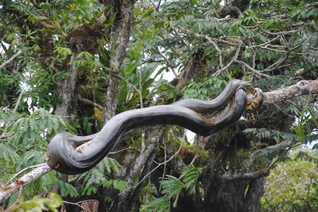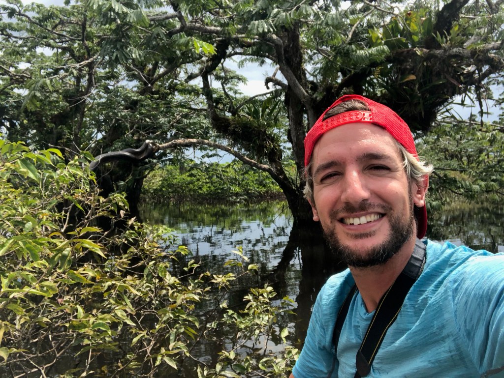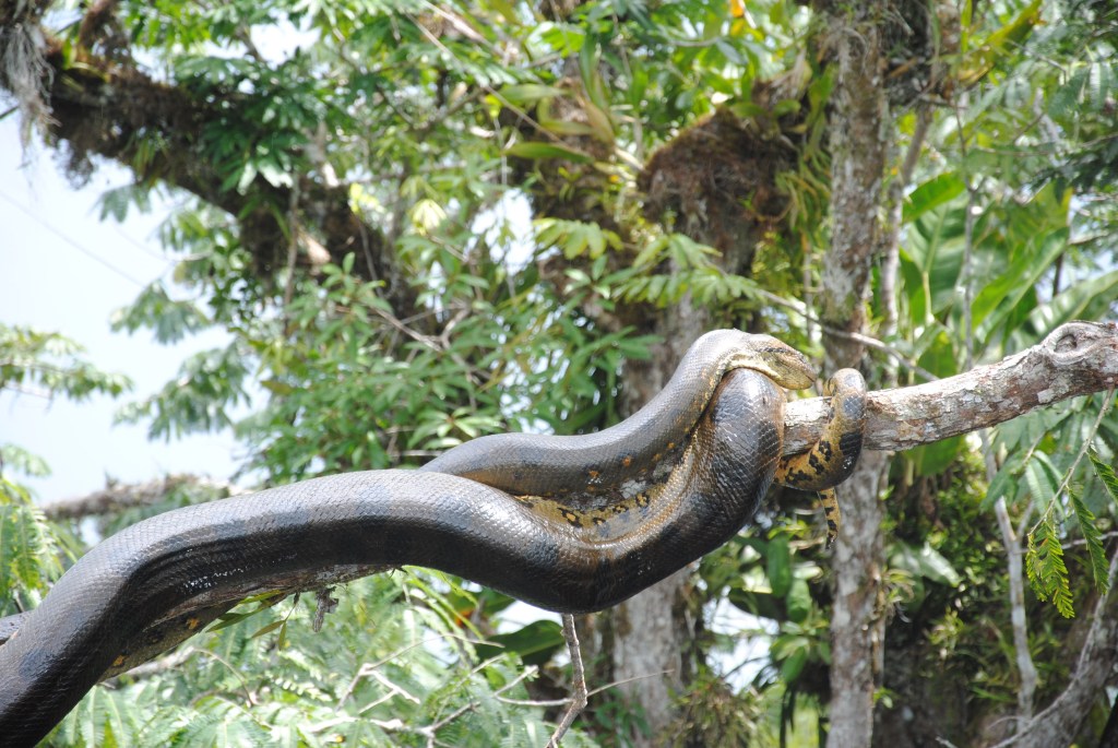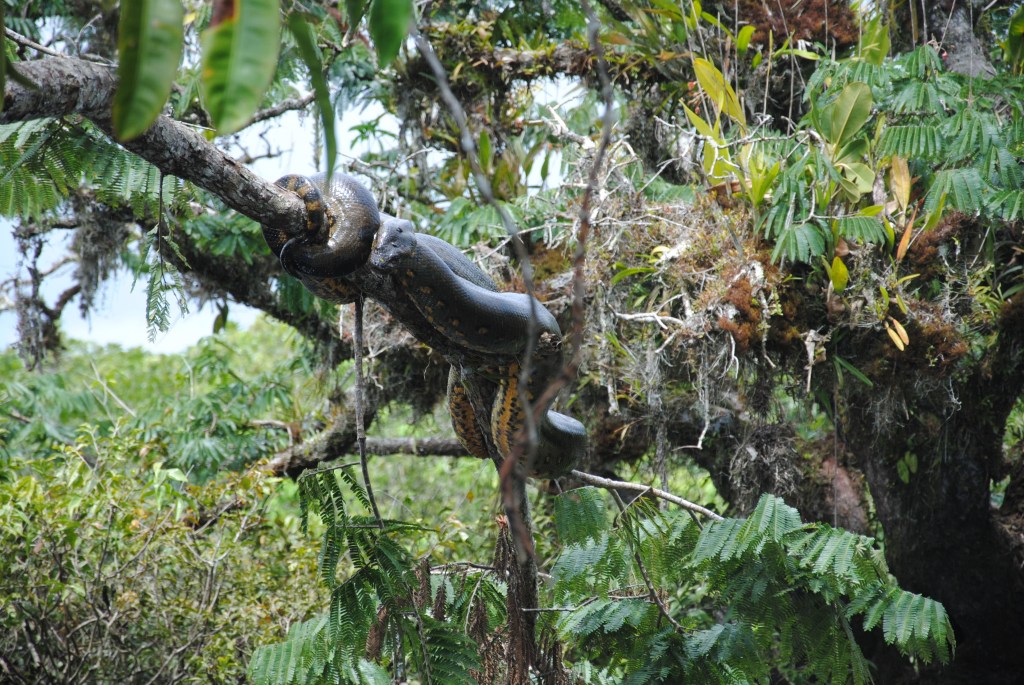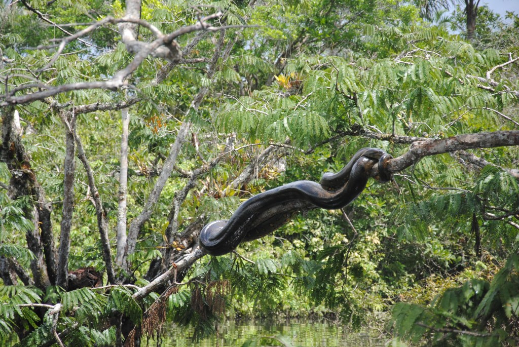 Nous en avons presque oublié la traque de l’anaconda. Pas Jacob. Nous croisons une autre pirogue, et Jacob amorce une discussion énergique avec son pilote. Un anaconda a été aperçu non loin ! Nous ramons à perdre haleine sous les encouragements de notre guide, dans la direction indiquée par son comparse. Julie, avec ses yeux de lynx, est la première à distinguer la bête. Quelle image extraordinaire ! Un gigantesque serpent prend le soleil, étalé sur un branche quelques mètres au-dessus de l’eau. Il est plié en deux, le bout de la queue ramené au niveau de sa tête. Son dos d’un vert sombre est parsemé de subtile tâches noires, lui donnant une teinte marron foncé. Son ventre est plus coloré, jaune taché de noir au centre, et taches jaunes cerclées de noir sur les côtés. Deux bandes noires partent de l’extrémité de ses yeux, soulignant son regard tel un trait de crayon épais. Avec ses six mètres de long, trônant ainsi majestueusement sur son arbre, c’est assurément lui, le roi de la jungle. Gonflés d’adrénaline par cette royale rencontre, nous nous approchons, téméraires, à quelques mètres seulement du reptile. Avant de faire le tour de l’arbre pour l’admirer d’un autre angle. Avec une excitation enfantine, nous prenons quelques selfies, avant de laisser le monstre à son repos.