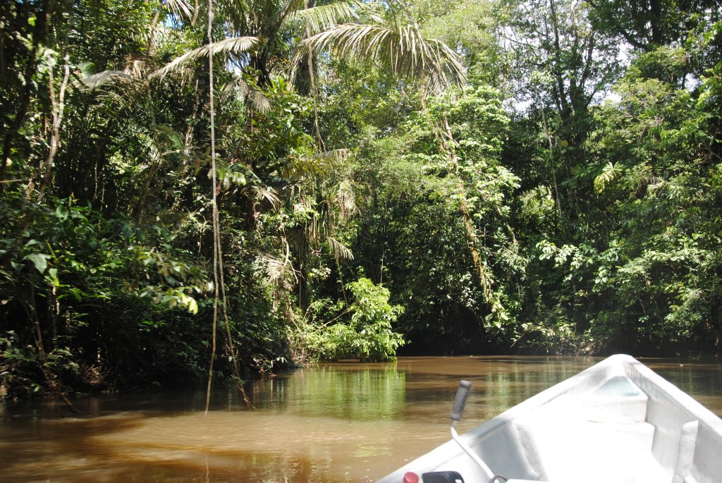 Nous partons, sous le soleil, pour un prodigieux voyage de deux heures sur les méandres de la rivière Cuyabeno. Nous voguons sur une eau marron, couleur café au lait, teintée par les nombreux sédiments charriés par la rivière. Il faut à Sergio toute son experience pour slalomer entre les troncs d’arbres morts qui flottent ici et là. Autour du canot, une végétation luxuriante déborde sur les rives : fougères géantes, grands arbres d’un vert puissant, longues lianes tombantes ou entremêlées dans les branches…Nous sommes au cœur de la jungle.