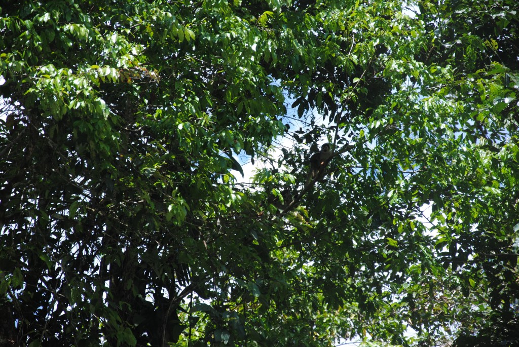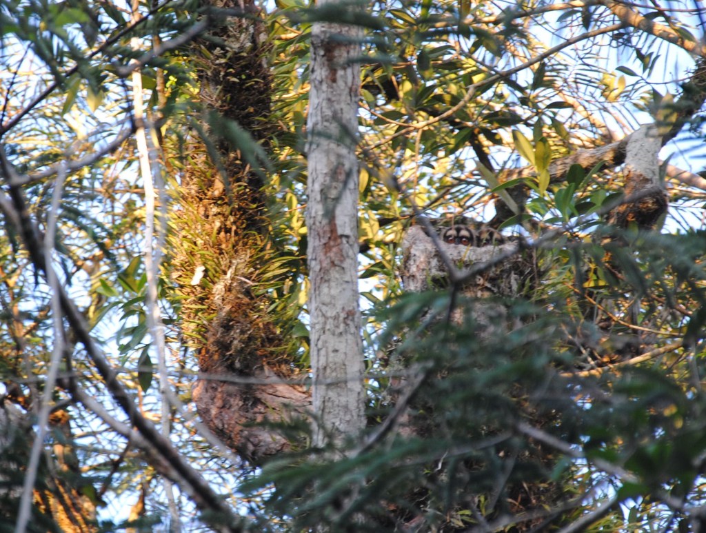 Clou de ce formidable spectacle naturaliste, de petits singe hiboux, réveillés par notre faute, sortent leurs drôles de têtes aux grands sourcils blancs de la branche creuse où ils avaient élu domicile pour leur repos diurne.