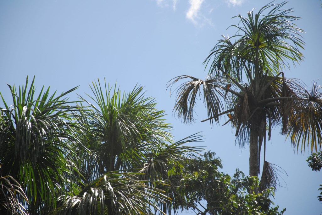 Partout où nos yeux se portent, des oiseaux, accrochés à ces arbres si particuliers au milieu de ce paysage unique : pigeons d’Amazonie couleur lie-de-vin ou magnifiques perruches vert amande.