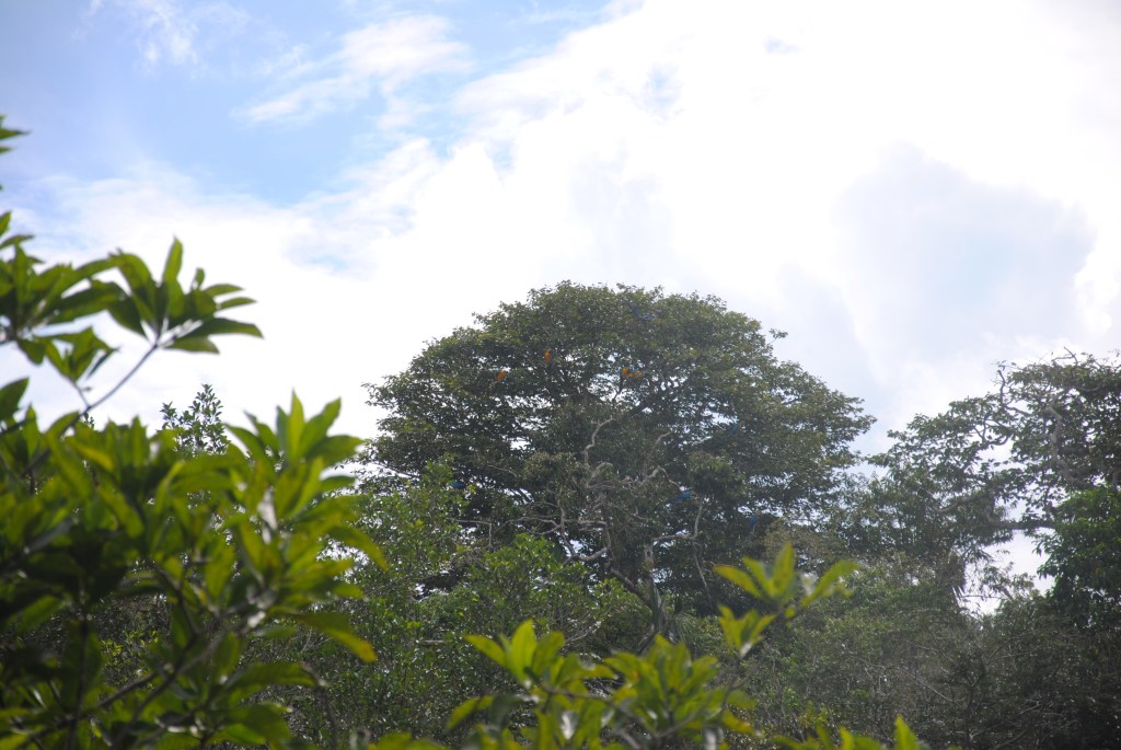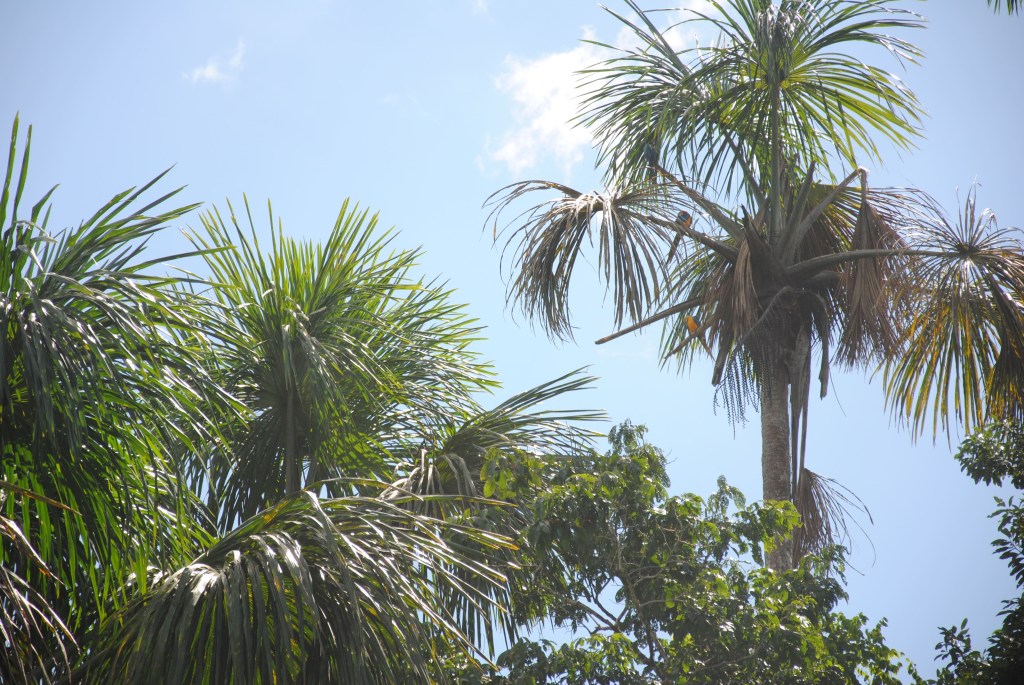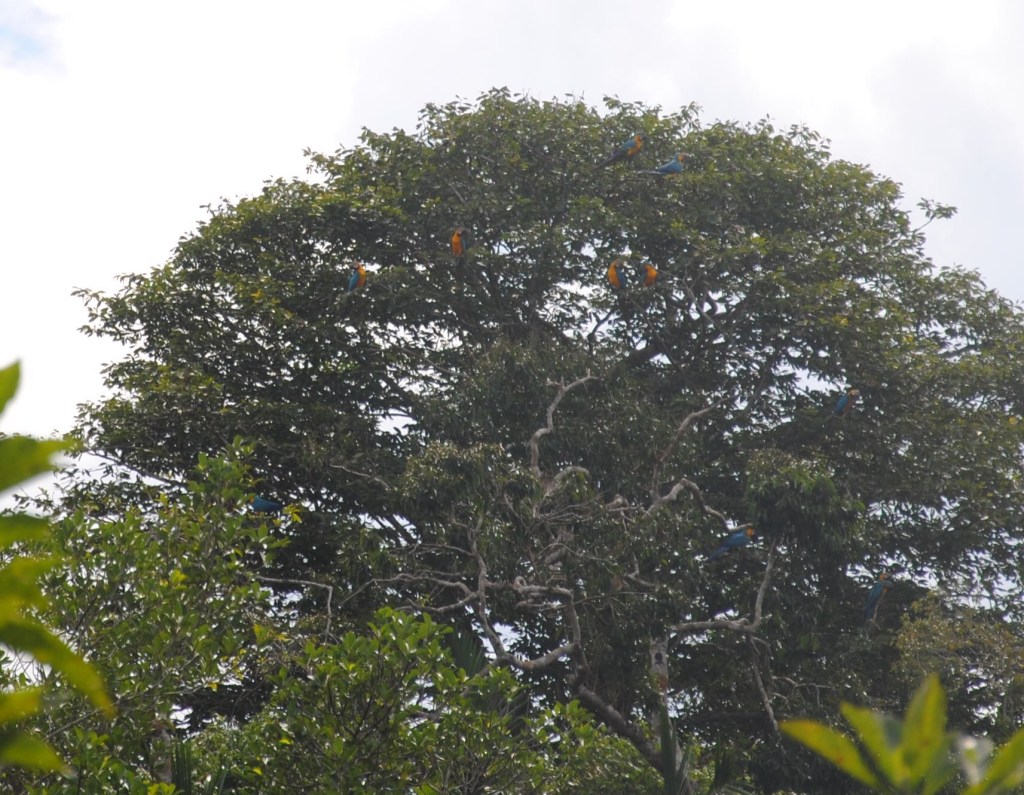 Jacob lui, tout aussi enthousiaste que nous (si ce n’est d’avantage), ne s’avoue pas vaincu. Il scrute le ciel, mais surtout les arbres : “si tu veux trouver l’oiseau, trouve l’arbre” énonce-t-il avec une humble sagesse. Et il trouve l’arbre. Nous nous postons à bonne distance, et regardons, médusés, les aras bleus, deux par deux, se poser sur les branches. Nous en comptons quatorze ! Nous les admirons longtemps, jumelles au poing, avant qu’ils ne s’envolent dans un seul et même élan, pour un défilé haut en couleurs.