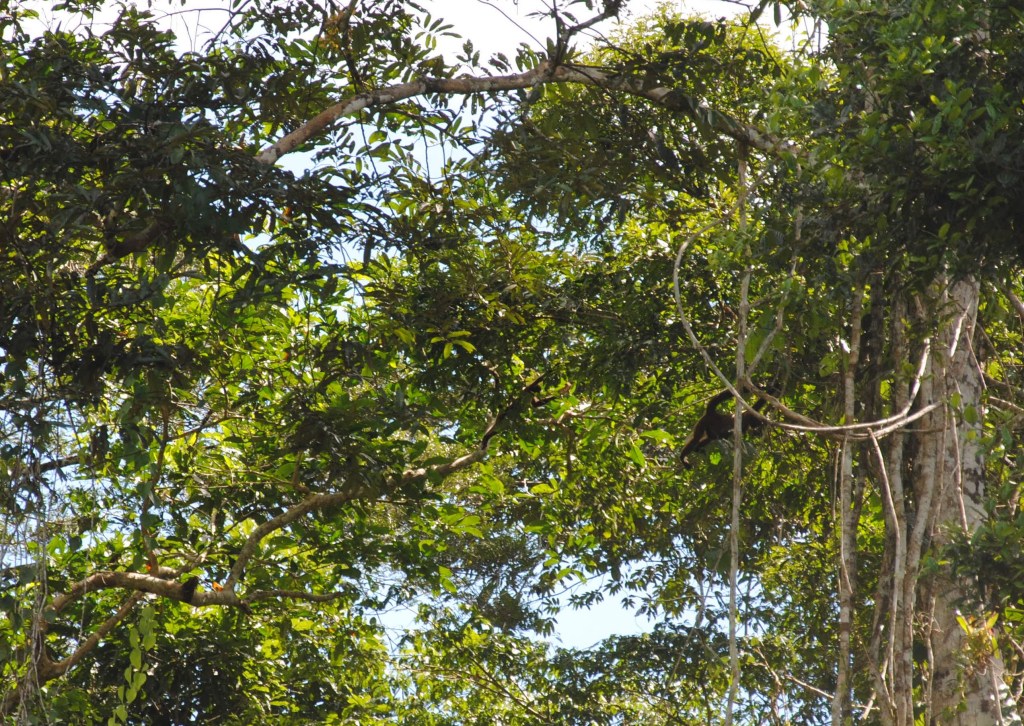 Quelques arbres plus loin, se sont les singes saké qui s’ébattent. Bien plus gros que leurs congénères vus plus tôt, ils n’en sont pas moins agiles, utilisant leur longue queue pour se suspendre à des hauteurs vertigineuses. Noirs et touffus, ils supportent néanmoins la chaude moiteur de la jungle grâce à un mode de vie plus sédentaire et une activité moindre que leurs petits cousins.