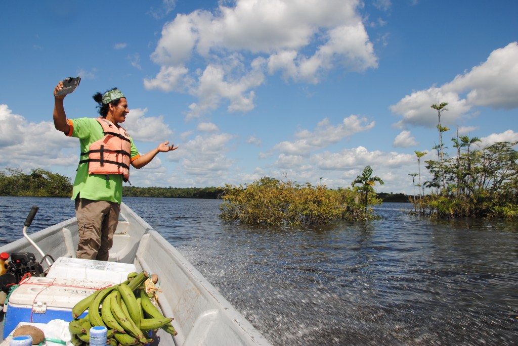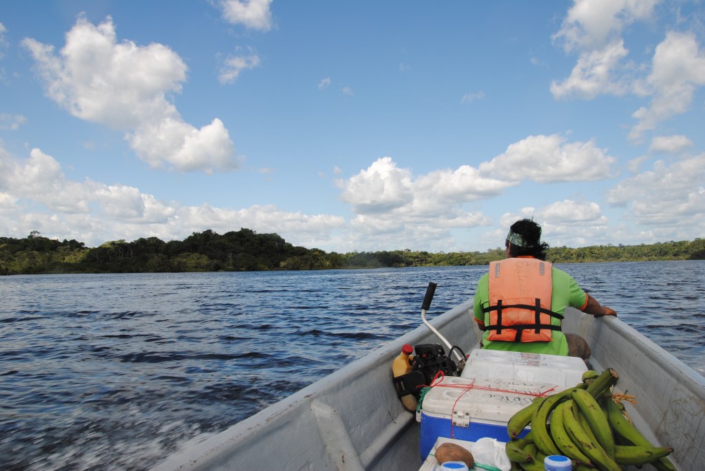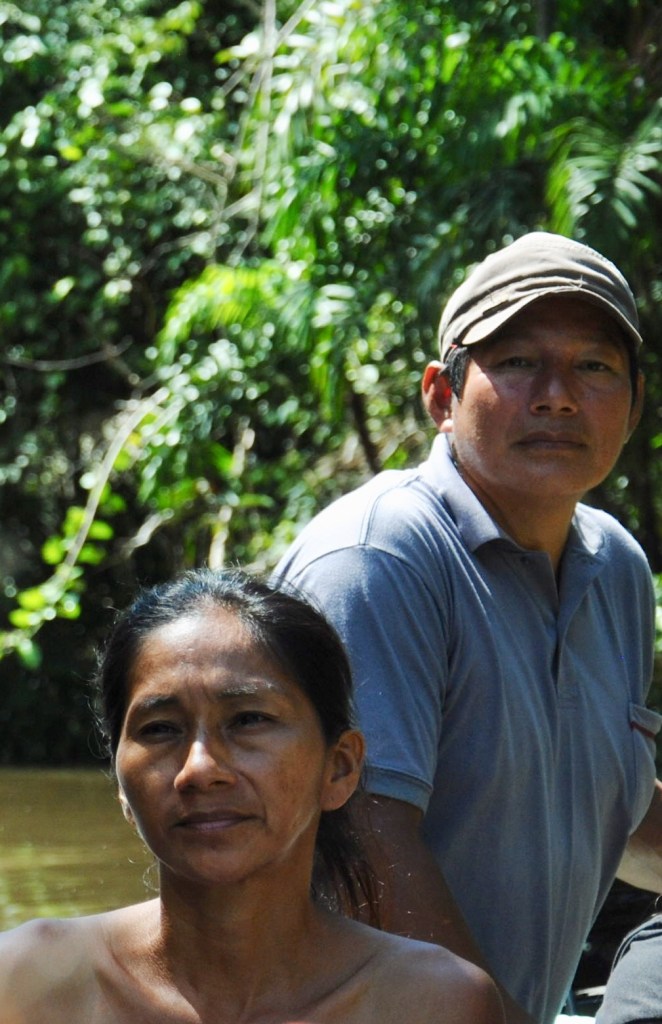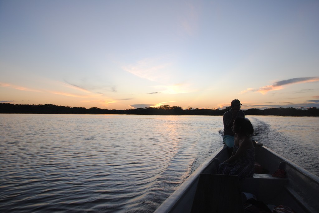 Nous embarquons alors dans un long et étroit canot, piloté par Sergio. Teint mat, regard fier, et force herculéenne, Sergio est membre de la communauté Siona, qui a donné son nom à notre lodge et dont le village se situe plus bas sur la rivière. Il est accompagné de sa femme, dont la beauté sauvage nous subjugue tous les trois.