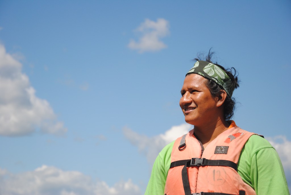 Nous reprenons place dans le petit canot et ramons gaiement dans l’iguapo. Concentré, et joueur, Jacob a à cœur de remplir sa mission : nous accostons sur une autre petite presqu’île, où les aras ont leurs habitudes, se nourrissants de grands arbres morts.