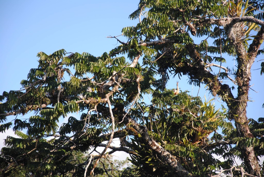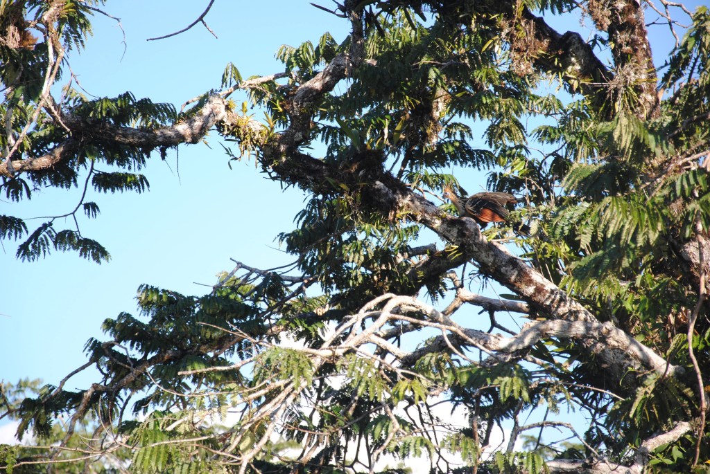 Ces arbres magiques, isolés de la “forêt de terre ferme” parfois par une dizaine de mètres de liquide, sont une terre d’accueil pour de très nombreux oiseaux, ainsi plus à l’abri des prédateurs. Les premiers habitants que nous apercevons sont les Hoatzins, oiseaux emblématiques de l’Amazonie équatorienne. Ces drôles de faisans à la robe automnale arborent fièrement une couronne faites de longs épis en guise de crête.