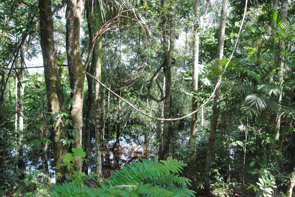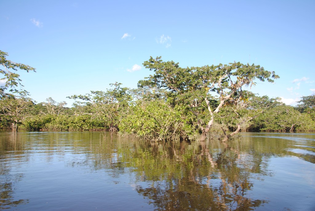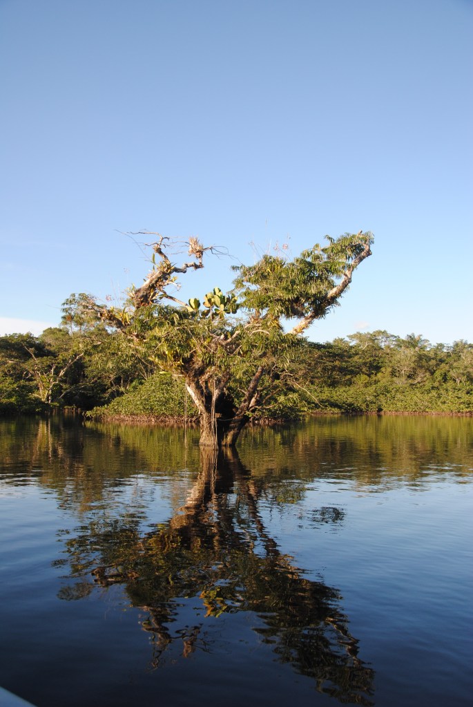 Notre périple amazonien débute à peine, et nous voilà déjà inondés d’images sublimes. Et nous ne sommes pas au bout de nos émotions, puisque la Laguna Grande, notre domicile pour les prochains jours, est une autre sensationnelle découverte. La rivière débouche sur une grande étendue d’eau, circulaire, dont la surface chromée brille sous le soleil. Sur ses bords, nous découvrons l’étonnante “iguapo”, la forêt inondée : tels des icebergs végétaux, de superbes arbres émergent des flots, quand une grande partie de leur tronc, et de leur feuillage, reste camouflée dans les eaux brunes. Parfois, seules quelques feuilles dépassent.
