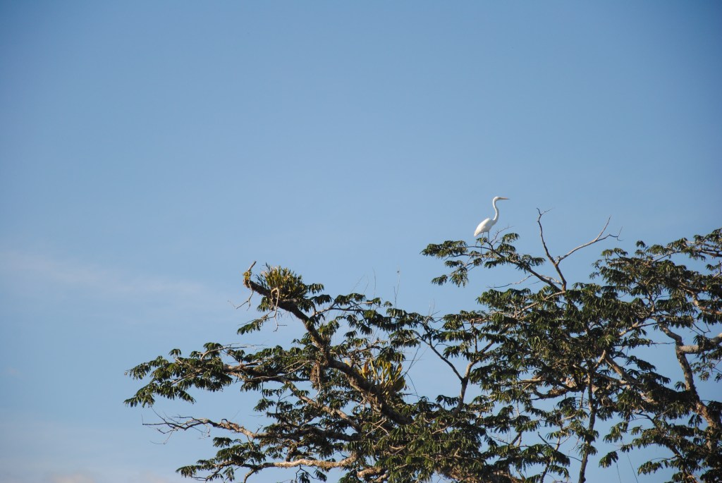 Plus loin, c’est une grande aigrette qui trône en haut d’un arbre avant de prendre son envol à notre approche.