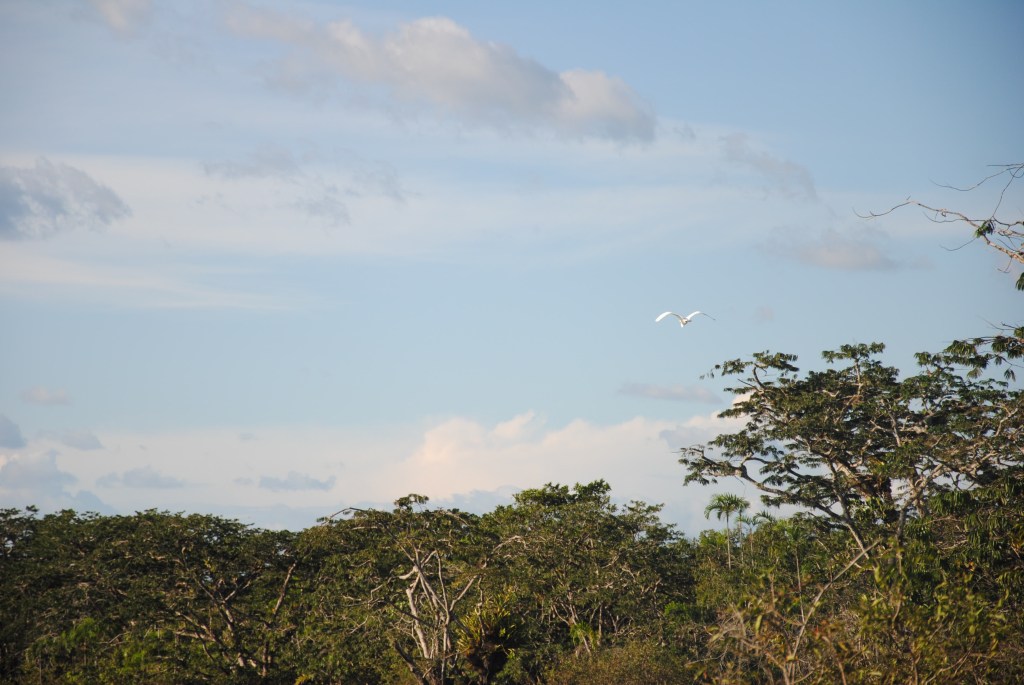 Nous voguons paisiblement dans l’iguapo, sous les yeux des nombreux hoatzins qui prennent le soleil, avant d’être témoin d’un de ces moments d’éternité dont la nature a le secret. Alors que, dans un mouvement vif mais discret, Jacob nous montre un splendide héron cocoï, un toucan à gorge blanche surgit de nulle part et survole furtivement notre embarcation ! Nous en avons la chair de poule…Ces grands oiseaux au long bec et aux extraordinaires combinaisons de couleurs sont magnifiques, et émouvants, avec leurs inharmonieuses proportions. Jacob suit le volatile des yeux, et nous ramons ferme afin de l’apercevoir une nouvelle fois. Nous le trouvons dans un luxuriant bosquet, au loin dans la forêt de terre ferme. Et nous l’observons longuement, à la jumelle. Posté dans un arbre immense, le bec grand ouvert, sous les rayons de soleil de fin du jour, le spectacle est prodigieux. Objectif atteint !