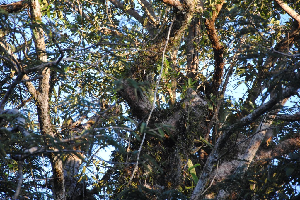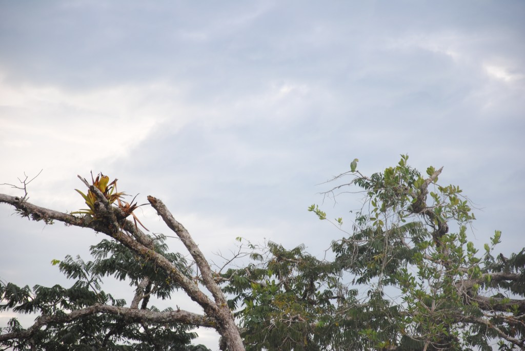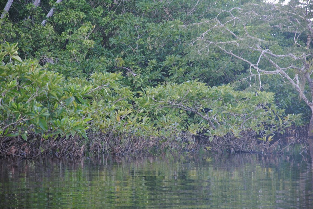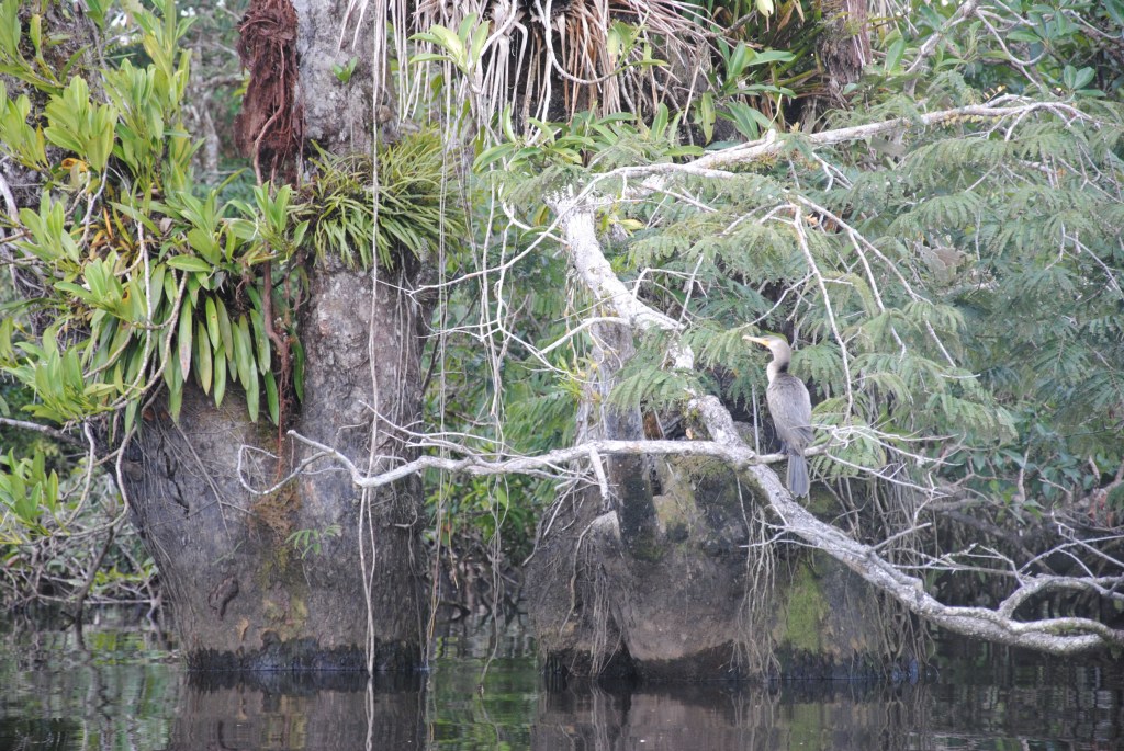 Nous rentrons faire la sieste au Siona, laissant l’unique couple de touristes présents au “Cuyabeno lodge” avec leur charmante voisine. À 16h30, l’infatigable Jacob sonne le rassemblement pour une nouvelle expédition, à la recherche des paresseux. Comme si nous n’avions pas eu notre dose de découvertes pour la journée! Afin d’être concentrés sur le repérage de ces curieuses bêtes nonchalantes, nous prenons le canot à moteur de Sergio, qui nous guide à travers les rivières alimentant la lagune. En chemin, nous croisons un joli petit perroquet vert à gorge jaune, ainsi qu’un austère cormoran, qui plonge dans les eaux brunes à notre approche.