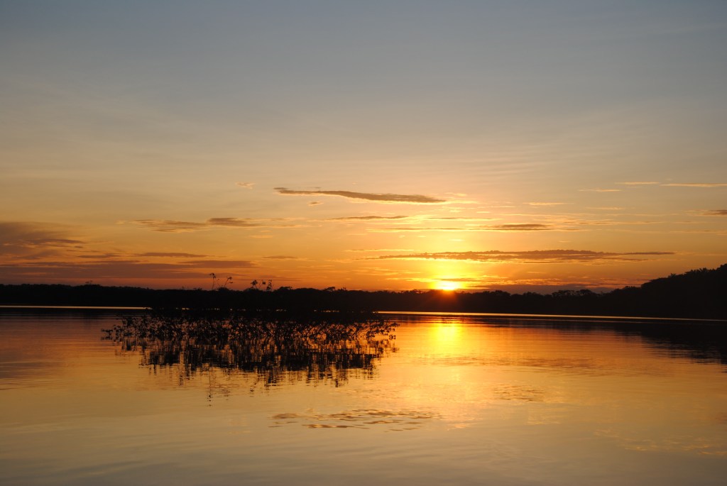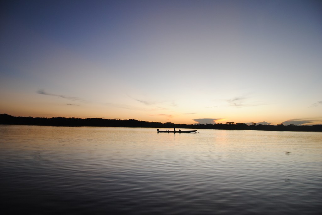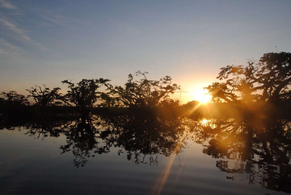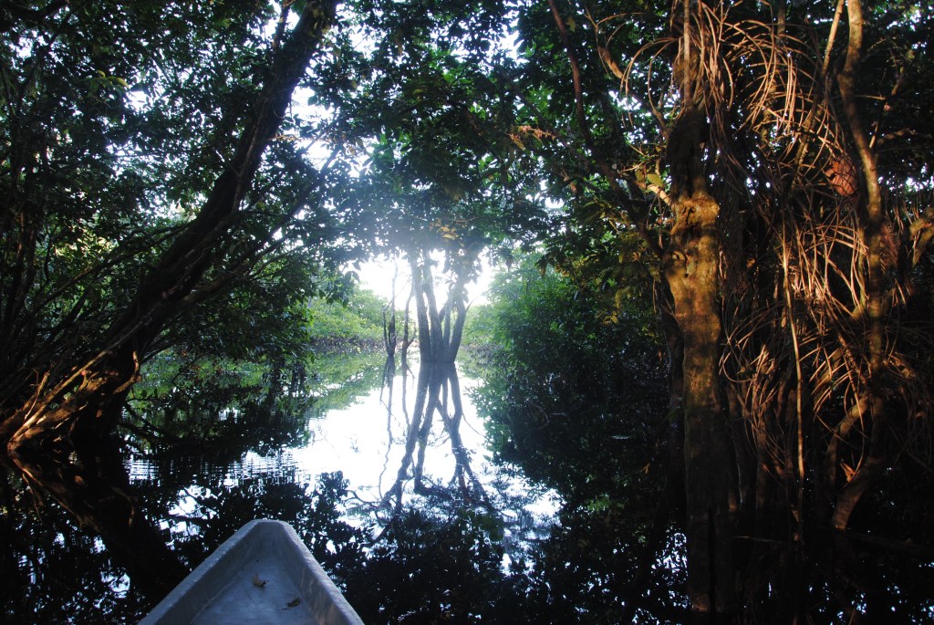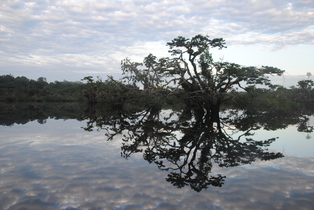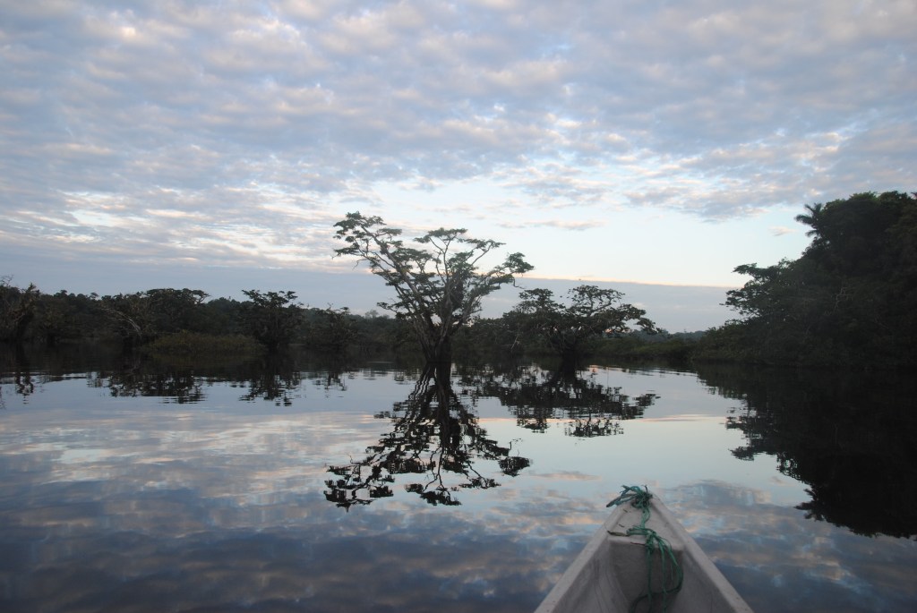 Lundi matin, Parc national Cuyabeno. Nuit agitée. Serpents et araignées en tout genre se sont succédés dans mes draps. Enfin plutôt dans ma tête, ses charmantes bêtes ayant sûrement mieux à faire que de hanter ma chambre. Je ne suis donc pas très frais à 6h, au moment de partir, pagaie en main, pour un tour d’observation matinale de la lagune en canoë. Mais je m’éveille sans mal devant la beauté de l’iguapo dans les lueurs de l’aube.