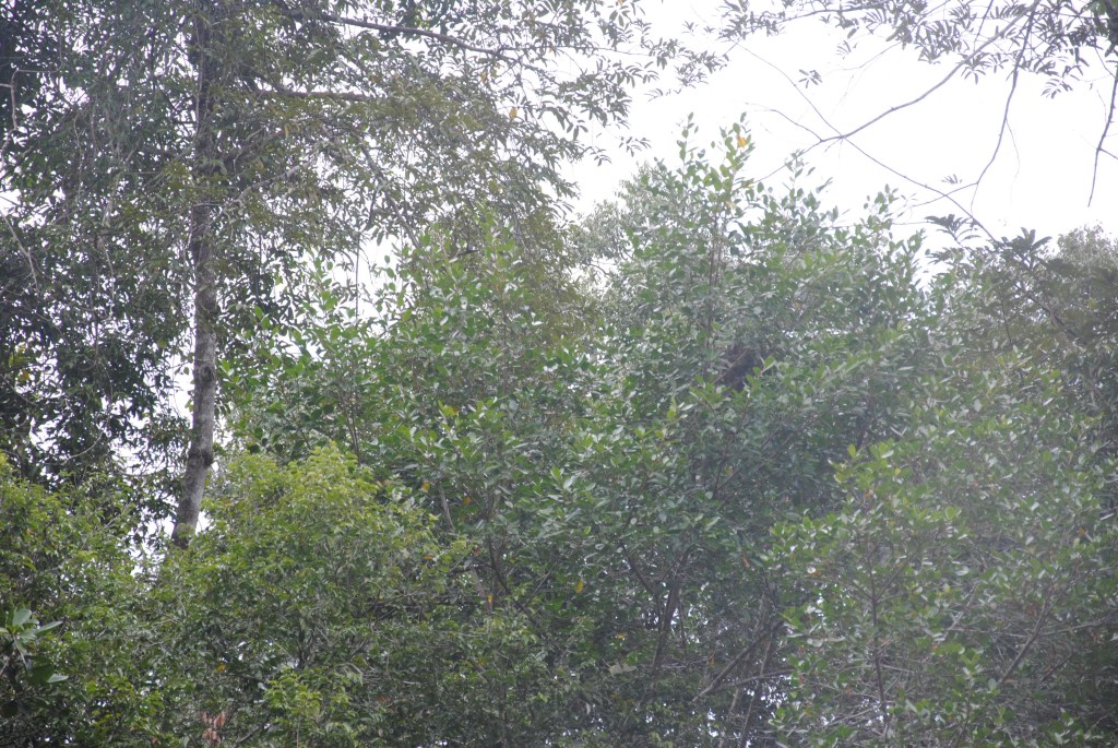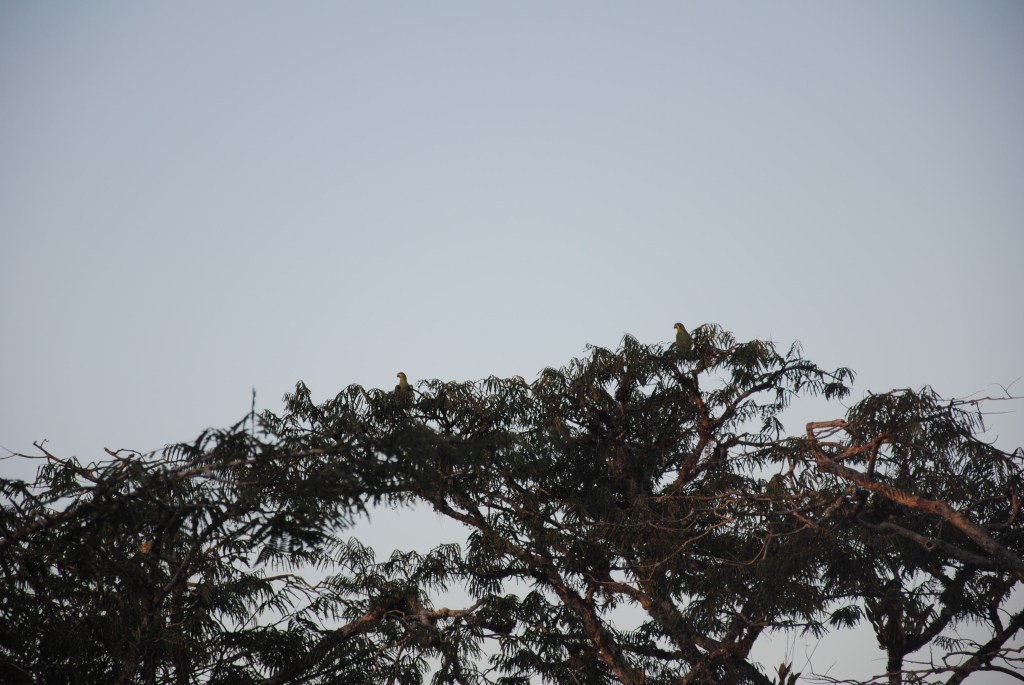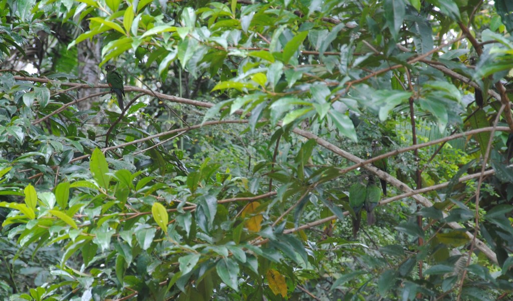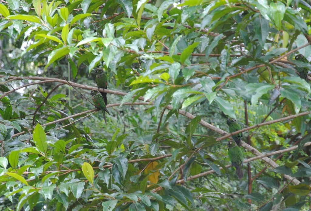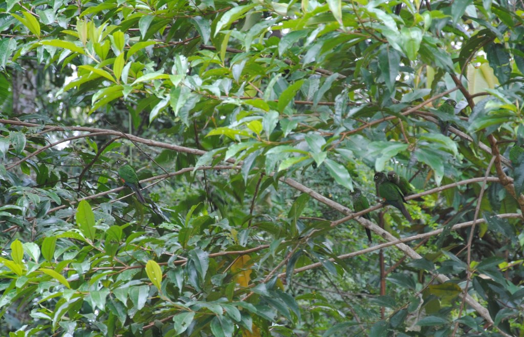 La marche est un peu ardue, il fait chaud sous la canopée et les moustiques sont nombreux et agressifs dans ces parages. Aurélien, barbouillé depuis deux jours, suit la troupe, au courage. Nous entendons à plusieurs reprises les grands perroquets bleus, mais sans parvenir à les voir. Nous rebroussons chemin, bredouilles, mais sur une petite clairière où la végétation mange peu à peu un lodge abandonné, une superbe consolation nous attend : une flopée de perruches à queue marron se protège de la pluie à l’abri des feuilles d’un petit arbre. Ventre vert, queue marron, tête grise, elles se perdent dans le feuillage. Mais le contour de leur yeux d’un blanc lumineux, ainsi que leur cou tacheté nous permettent de les repérer. Et même d’observer des comportements sociaux attendrissants, entre chants et câlins. Superbe moment, qui redonne de l’énergie à Aurélien pour reprendre les pagaies.