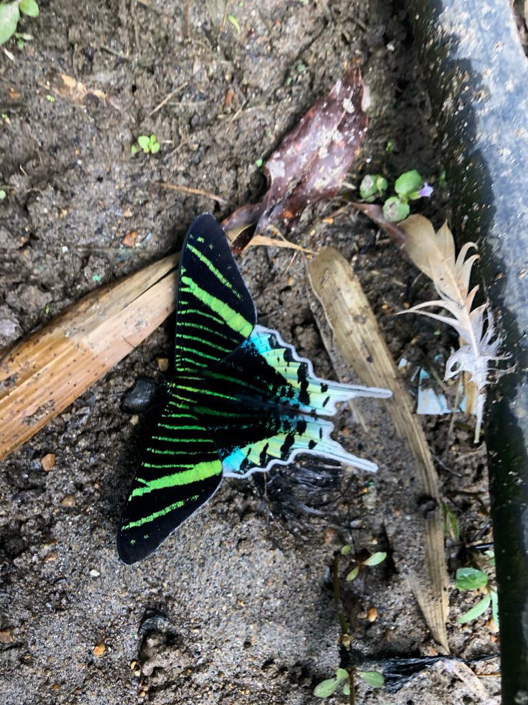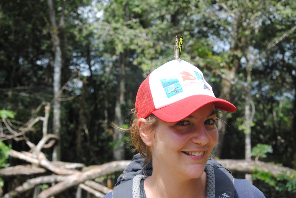 Nous grimpons dans un minibus, et admirons le paysage pendant que Jacob nous explique l’économie de la région, et la vie des communautés qui vivent au plus profond de la jungle. Deux heures plus tard, le véhicule nous dépose au bord de la rivière, près d’un pont où volent oropendolas, caciques, et de superbes papillons.